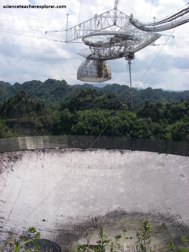 Pictured below, The main instrument at the observatory is the Arecibo Telescope, a 305 m spherical reflector dish built into a natural sinkhole, a cable-mount steerable receiver mounted 150 m above the dish, and several radar transmitters for emitting signals. For more than 50 years, the Arecibo Telescope was the world’s largest single-aperture telescope, surpassed in July 2016 by the 500 m Aperture Spherical Telescope (FAST) in China.