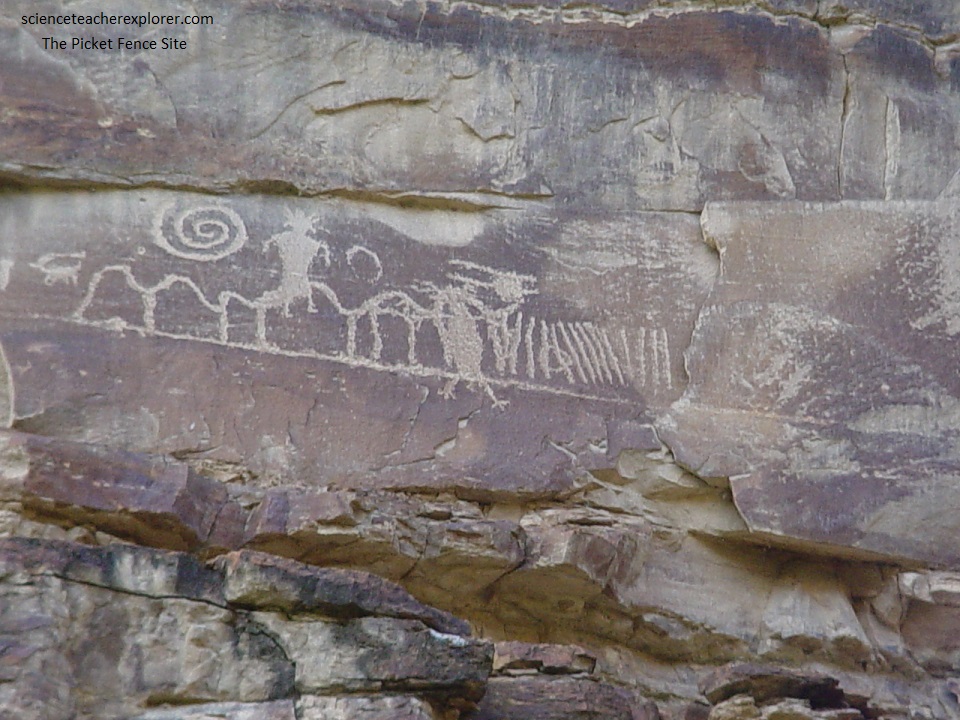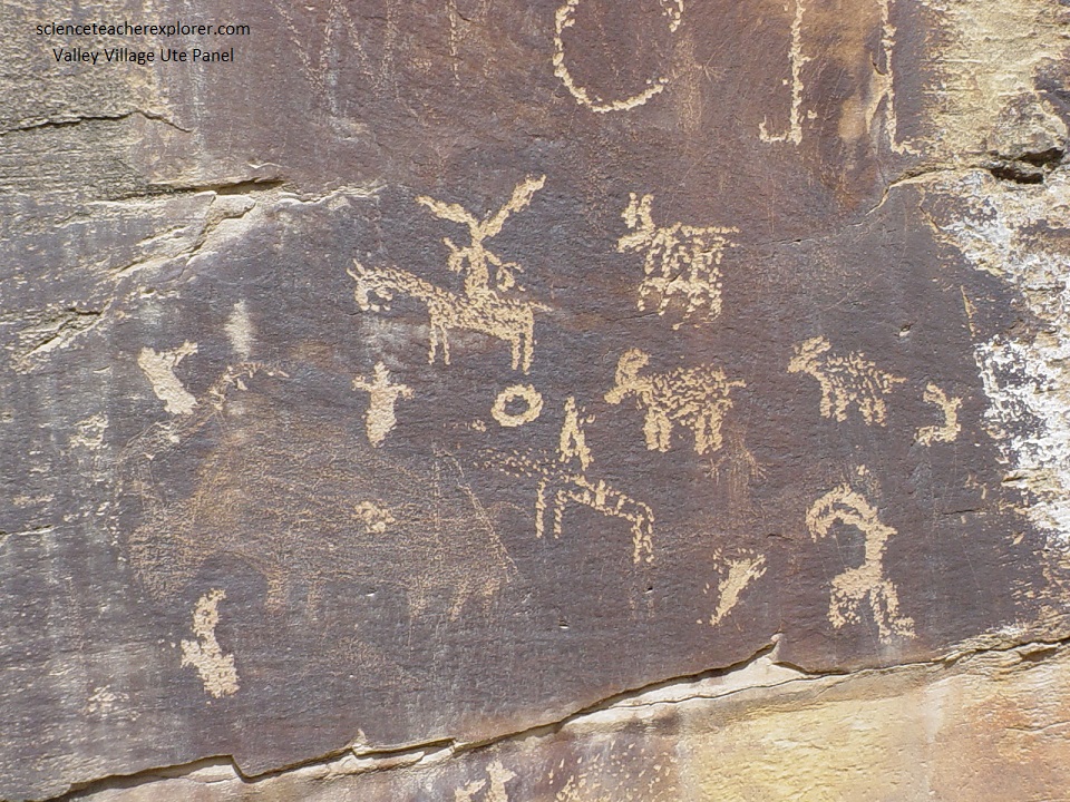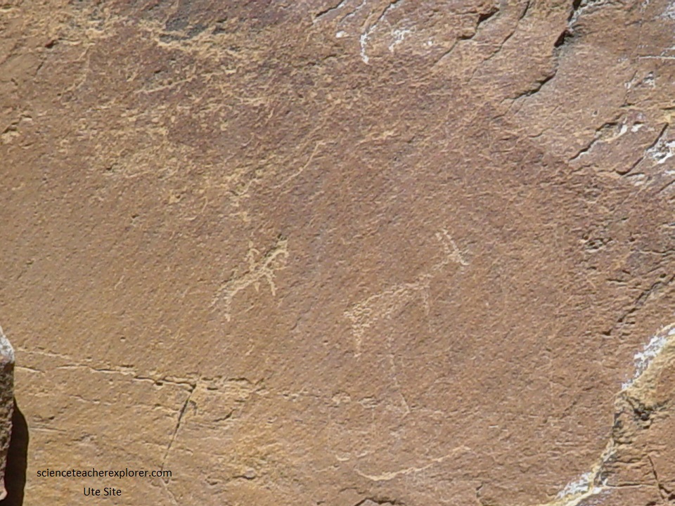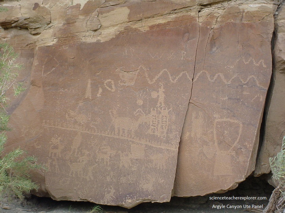 Pictured below, about 0.25 km west of the Argyle Canyon Junction and north of the road and pullout; features a horse with rider being led by an individual with a rope. This panel lacks the elaborate head-dresses depicted at other places in the canyon. It’s this simplicity that may be evidence of a deterioration in rock art traditions over time. This panel also features two poorly defined animals and a rectangular human figure similar to those attributed to the Fremont elsewhere in the canyon. It should be noted that when the Spanish arrived in Utah during 1776, the Utes did not have horses. However, later the Utes subsequently developed a thriving trade with the Spanish and later the Mexican governments, becoming the dominant Native American tribe in the Rocky Mountains. This would indicate that the petroglyph below is of Ute origin.