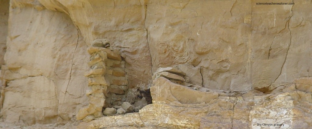 Pictured below, at 3 km up Dry Fork Canyon and 33 m from a parking area, are the remnants of a small stone and adobe granary located about 3 meters above the ground on a narrow ledge. Prehistoric farmers in the region employed at least 3 different storage strategies, probably to minimize the possibility that all foodstuffs would be lost. One strategy involved small storage structures near ground level that are easily visible and easily accessible, probably for immediate access, (this was an of the examples). A second strategy involved medium and large structures high on inaccessible cliff ledges it would require considerable expenditure of time and energy to retrieve foodstuffs. This strategy was likely to discourage incidental raiding by other groups. A third strategy involved carefully camouflaged subterranean cists.