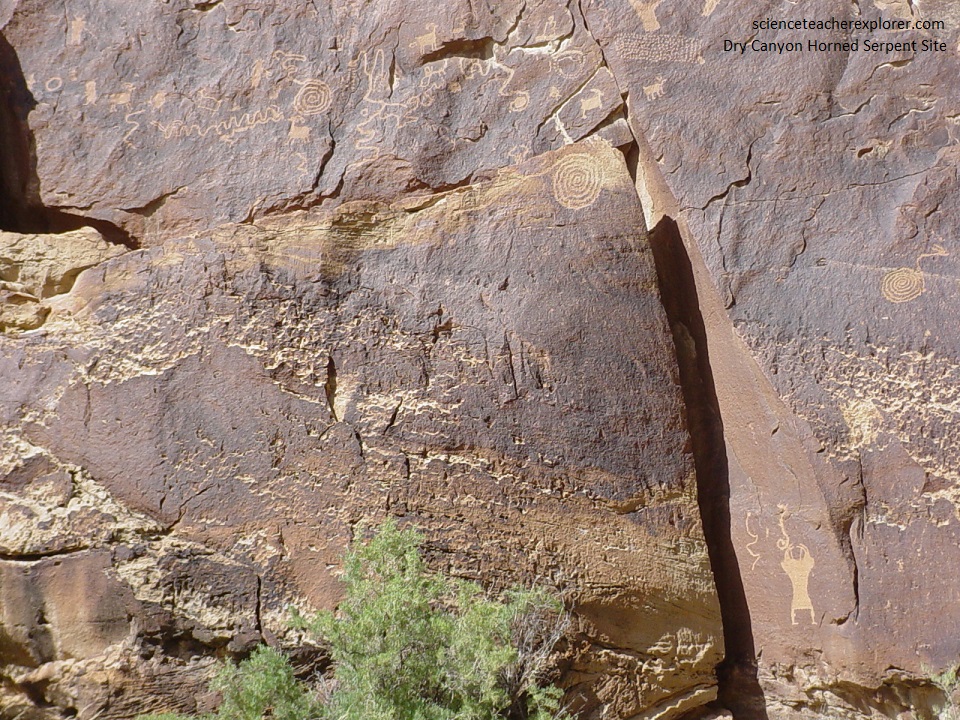 Pictured below, at 3.2 km up Dry Fork Canyon, is a petroglyph panel located at the north edge of a small dry wash on the right side of the road. It features at least five distinct spirals, including one with a horned head. Other motifs include dot matrixes, wavy lines with horns or heads, and a human trapezoid. All are typical of Fremont panels elsewhere in 9-Mile Canyon. [The horned serpent motif is unusually common in 9-Mile Canyon, and it is similar to the Kolowisi and Palulukon horned serpent figures recognized by modern Puebloan peoples in Arizona and New Mexico.]