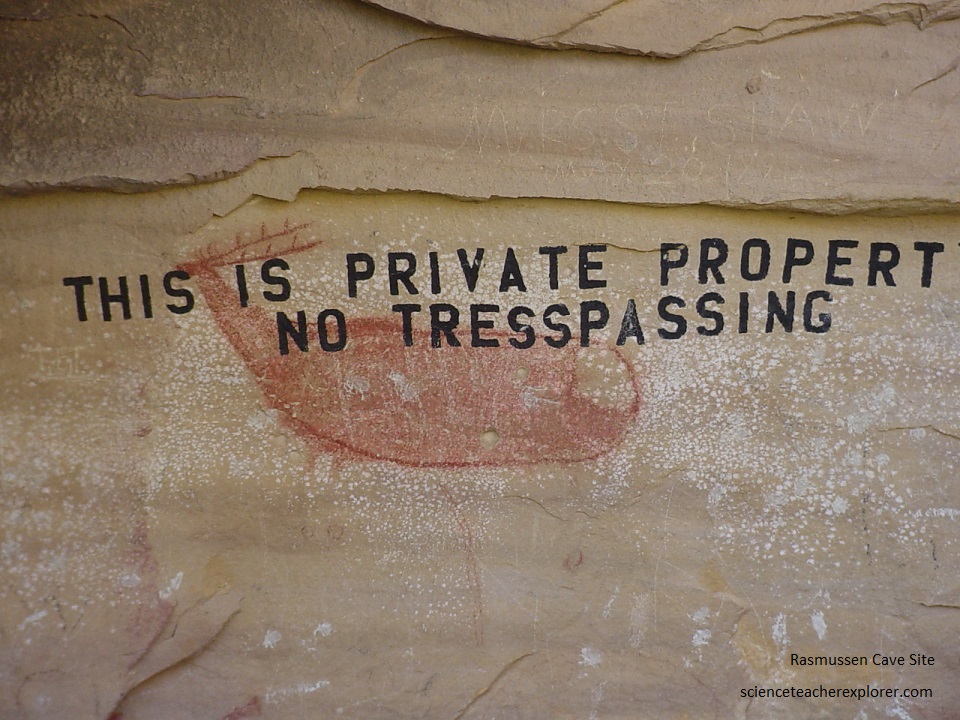 [Between Dry Fork Canyon and Daddy Canyon]. Pictured below, is in the “Rasmussen Cave” (0.5 km east of the Dry Fork turnoff). One of the most famous sites in 9-Mile Canyon, Rasmussen Cave is actually a series of sites, including two adjacent rock rt sites and the shelter itself, which has additional rock art. During the 1920s and 1930s, researchers uncovered several human burials, figurines and other artifacts typical of Fremont and perhaps earlier peoples. Pictured above, the large red naturalistic elk on the shelter wall is considered to predate the Fremont, and some see the style as contemporaneous with the Basket-makers of the Southwest. Other figures painted in white are of the same style.