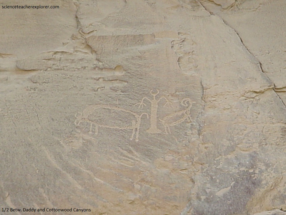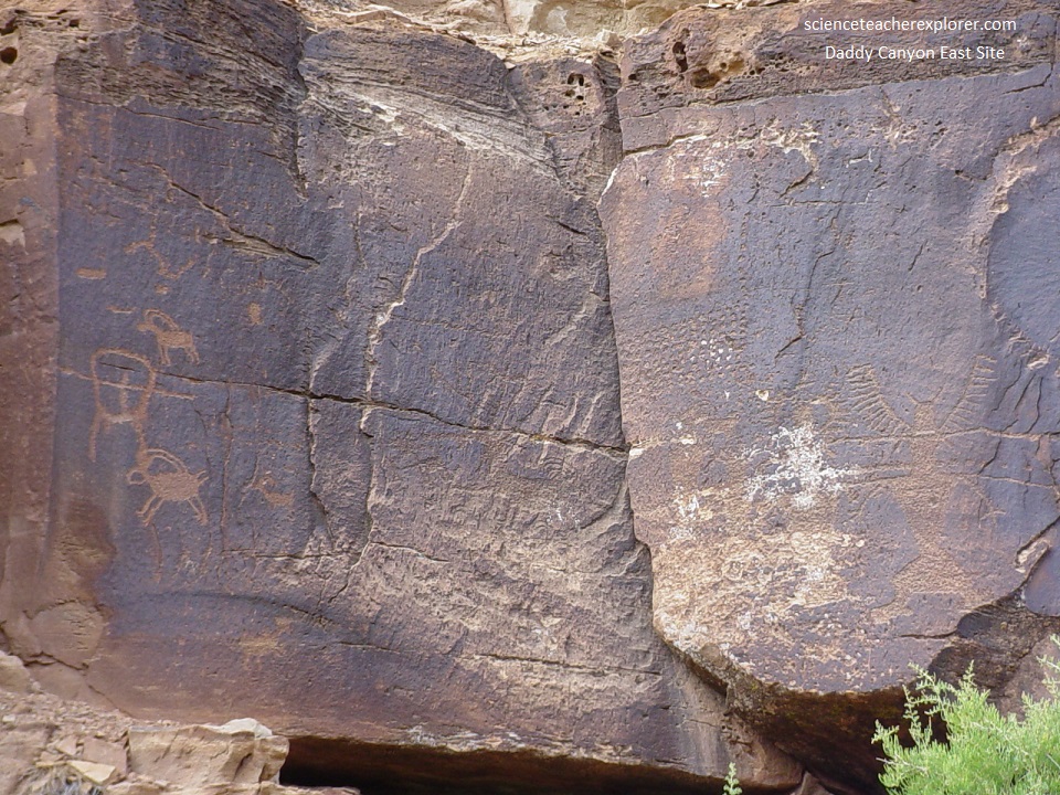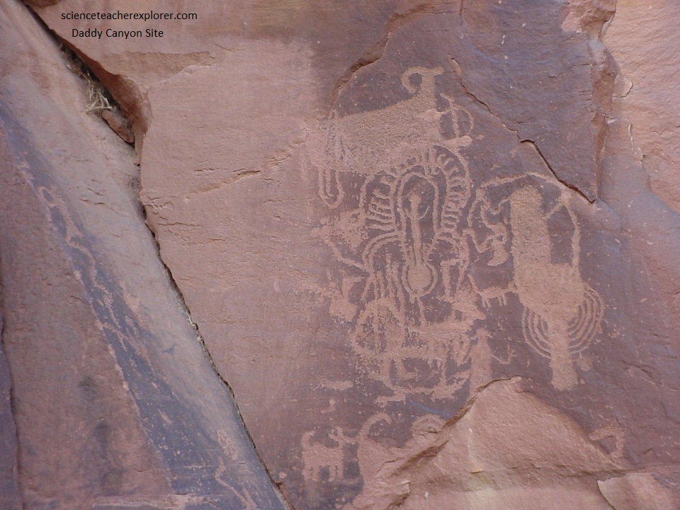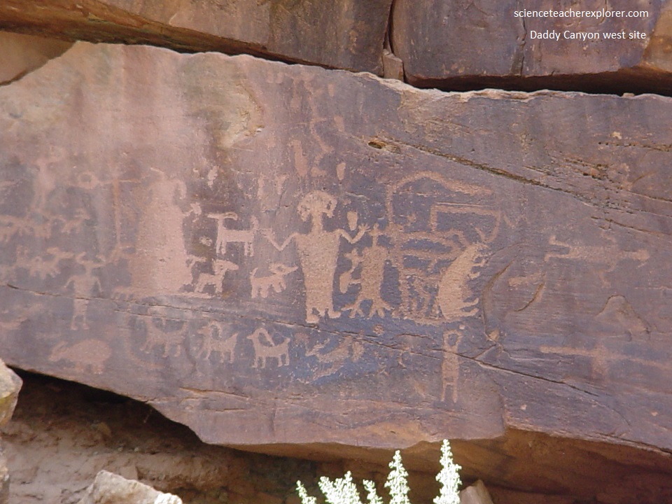 Pictured below, on the western side of the mouth of Daddy Canyon, is a petroglyph panel site near ground level. It features on panel with two Fremont-like trapezoids, several animals, abstract (or supernatural) human figures and a large burden-bearer figure with a feather head-dress.