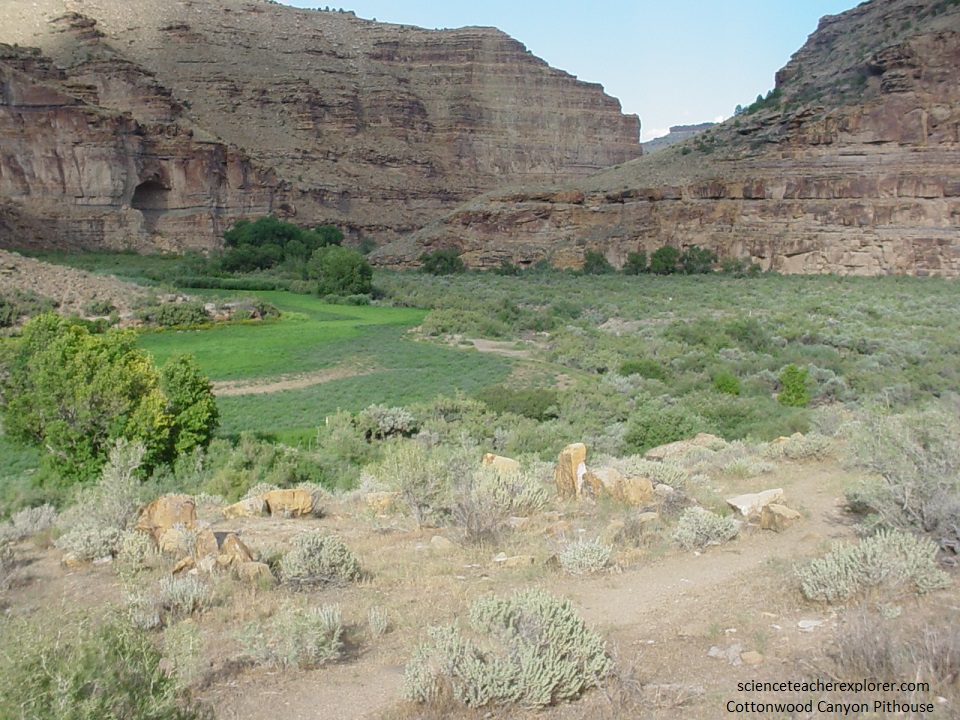 Cottonwood Canyon appears to have Pit-houses along the benches, storage structures hidden on cliff ledges and some of the most complex and visually spectacular rock art anywhere in the 9-Mile collection. Cottonwood Canyon was likely one of the major southern tributaries that offer easy access to the southern regions. Pictured below, on the western side of the mouth of Cottonwood Canyon, is the rubble remains prehistoric pit-houses. The one shown in the picture is arranged in a circular pattern encompassing an area about 7.5 m in diameter. Other pit-houses are close-by. The pit-houses are located on a bench above arable lands and near water, with a commanding view up and down the canyon. They were likely semi-subterranean and the interior dimensions will provide clues as to how many people lived, (whether the house was used by one generation or by many, and how the occupants kept warm). Pollen from the floor area will determine what plants were eaten, and bone fragments will identify what animals were hunted.