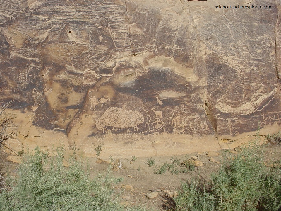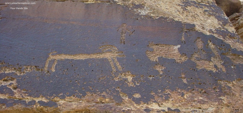Additional figures at the “Four Hands Site” are badly eroded, and some are visible only in the evening light. To the left on a patch of very dark patina, the bighorn sheep figure has a narrow, elongated body facing a buffalo figure, (pictured below). Above them is a human holding a short staff. To the right are additional human and animal figures mostly eroded from the patina.
