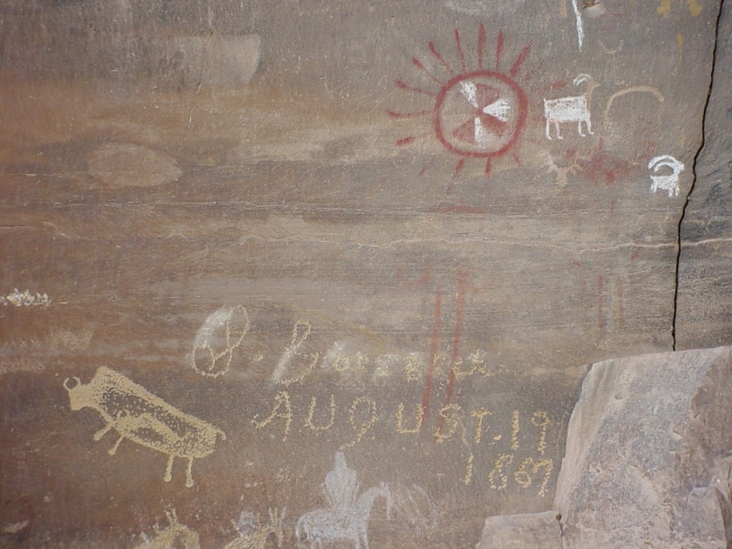 Pictured below, 33 m north from the “Large Buffalo”, is the Pregnant Buffalo panel, (a depiction of a large buffalo with a smaller buffalo evident in the stomach cavity). Just above are several figures painted in vivid red, white and yellow pigments. One sheep figure was first pecked and then painted white. Note that this panel features the historic inscription “S. Groesbeck August 19, 1867,” which would predated the arrival of ranchers in the region by two decades. It is believed Groesbeck was a prospector.