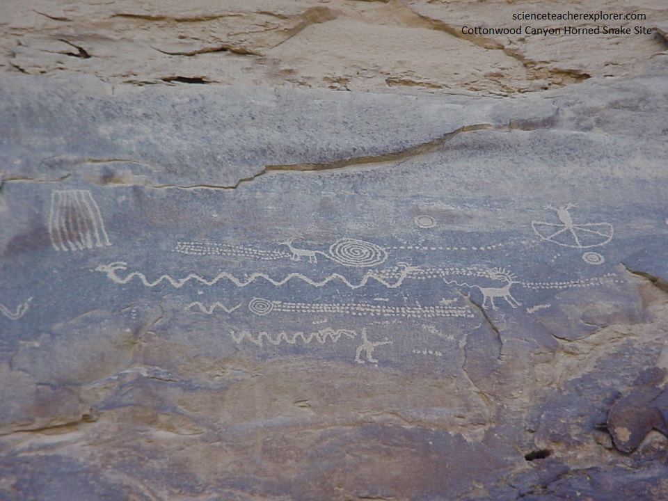 In 9-Mile Canyon, serpent heads are depicted with paired horns, single horns, antlers and even abstract elements that could be head-dresses. The significances of the horned serpent to prehistoric canyon dwellers has been lost. Another example is pictured below from another site in 9-Mile Canyon.