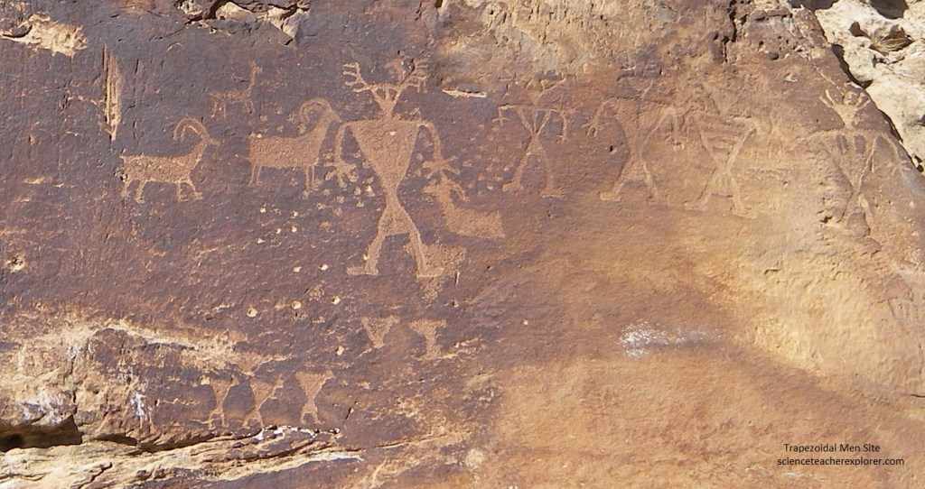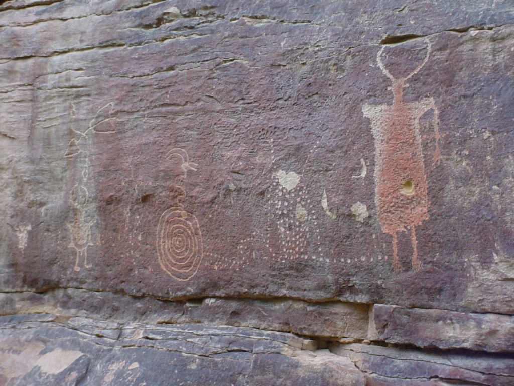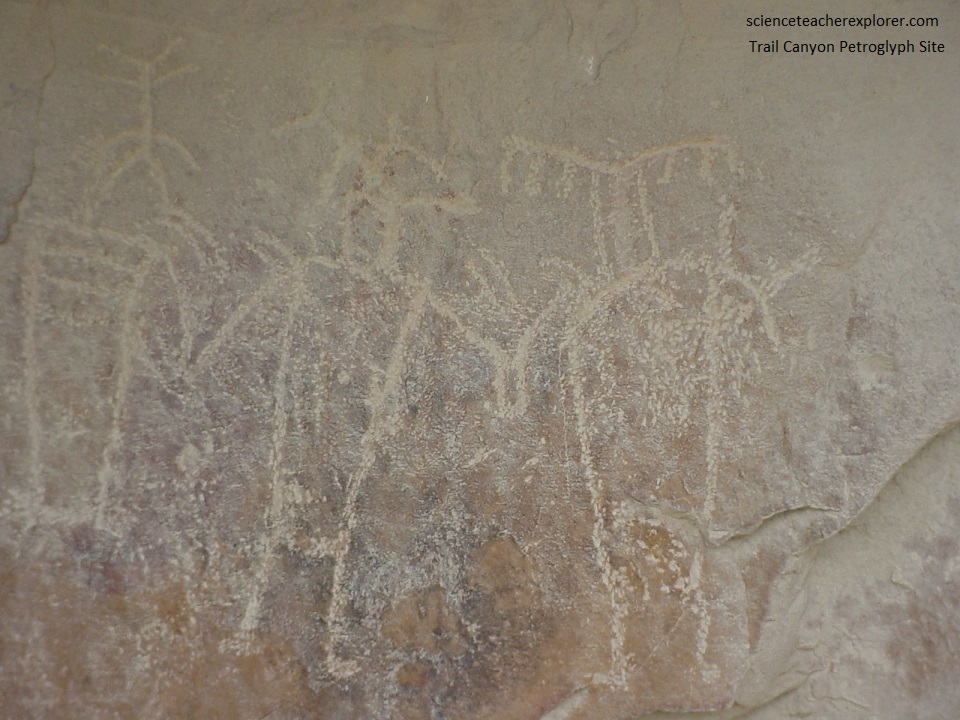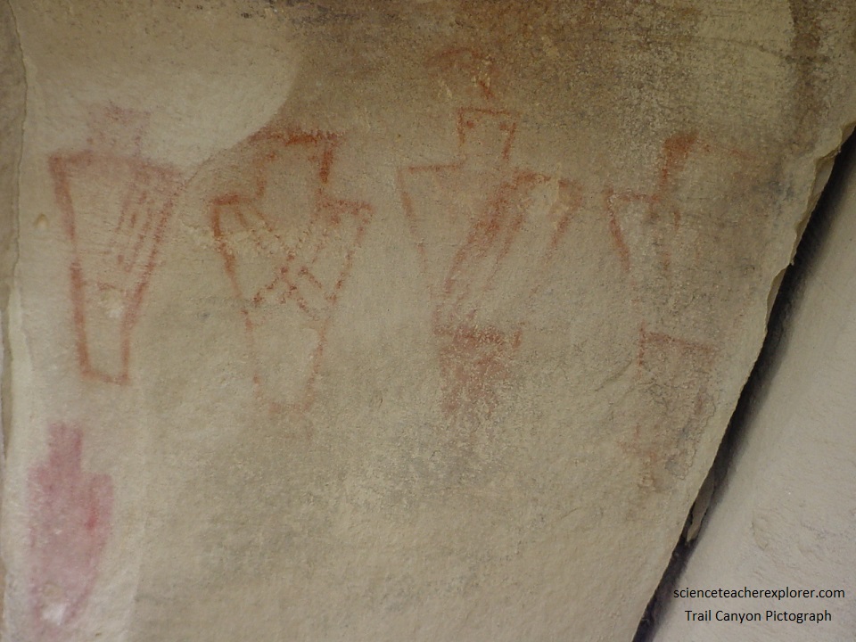 Pictured below, at about 0.1 km east of Trail Canyon, is a panel that has figures that are painted (pictographs) and pecked (petroglyphs). This panel features four faded human figures painted in outline with a reddish-orange pigment. The figures are trapezoidal (stylistically Fremont) that features square or “bucket-shaped” heads. The figures also depict bandoleers or sashes across the torsos.