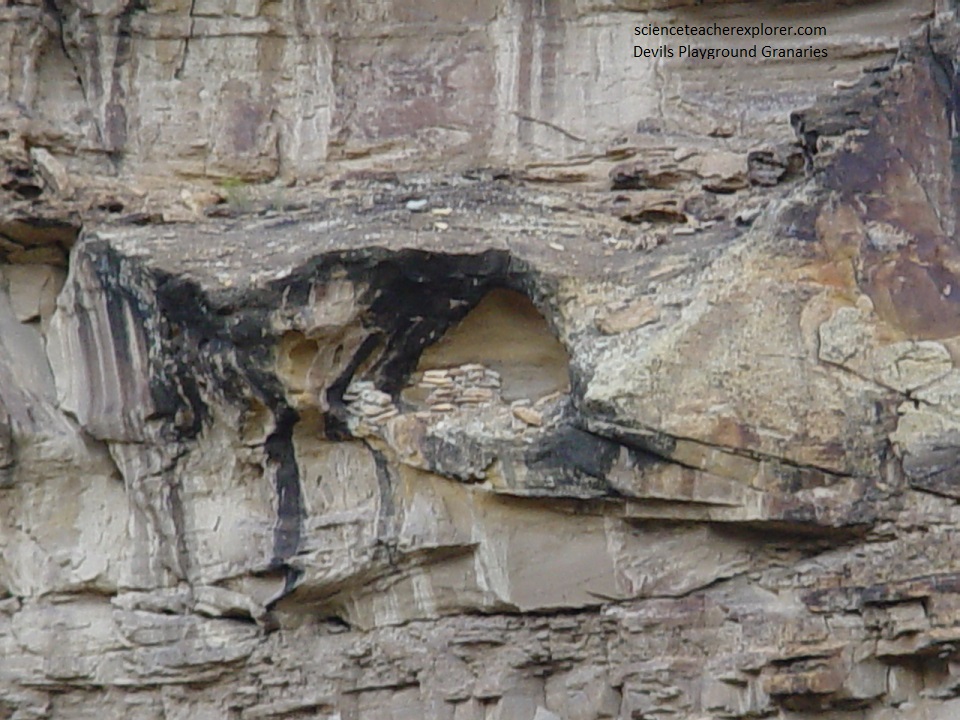 Pictured below, at the eastern side of the mouth of Devils Canyon and 13 meters above the valley floor, (in an alcove), there are 4-5 layers of slab-stones defining the outer wall of a granary. Traces of adobe are still present between the stone layers. How the prehistoric builders gained access to the granary is not known as there is no evidence of a ledge. The precarious location of this granary on a sheer cliff face illustrates a storage strategy that some facilities were not intended to be concealed from human passersby, but any attempt to raid the facilities would have required considerable time, energy and knowledge of access routes.