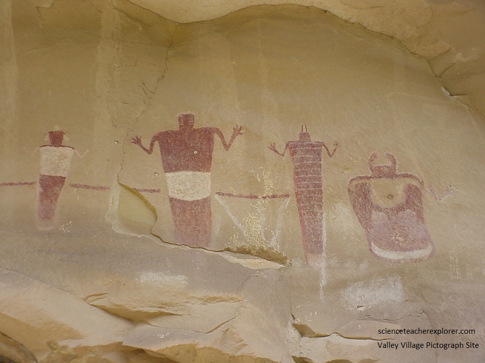 Pictured below, about 0.4 km southwest of Valley Village and 300 meters south of the road, is the famous Sheep Canyon pictograph panel, a row of 4 human figures painted in vivid red and white. Some rock art experts believe the figures represent a transition between a style attributed to Archaic hunters and gatherers (Barrier Canyon) and later Fremont farmer-foragers.