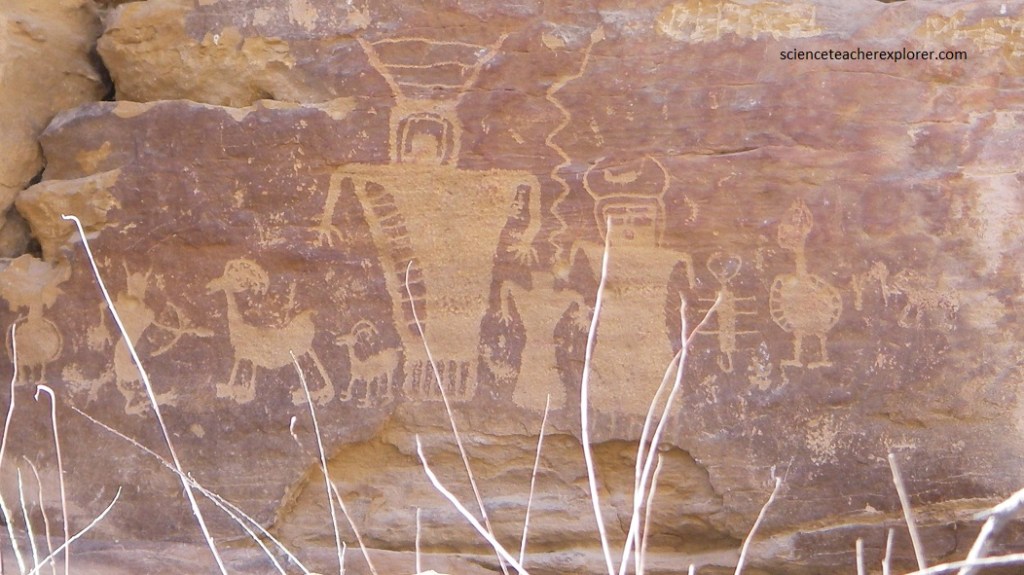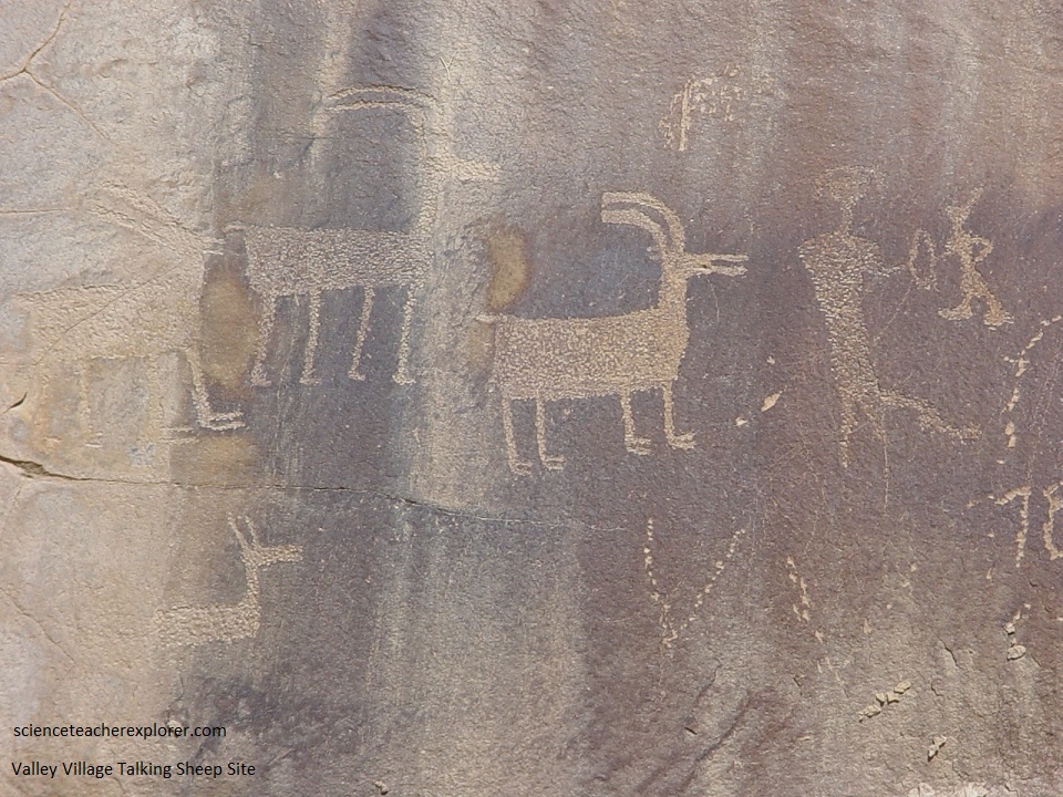 Pictured below, just south of the pictograph panel are large bighorn sheep executed in a typical Fremont style with exceptional precision, depicting even cloven hoofs. One appears to be talking to a long somewhat trapezoidal human engaged with a smaller figure. Neither are “classic” Fremont motifs.