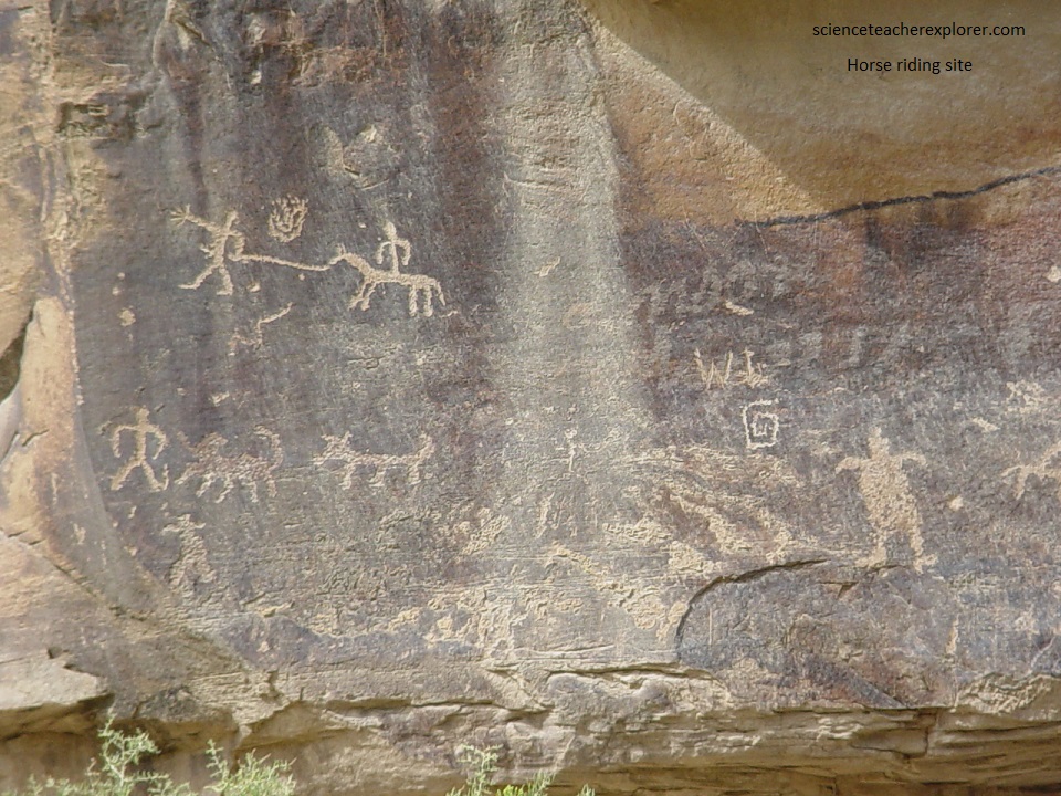 Pictured below, another panel features a horse and rider with elaborate head-dress. This is likely attributed to early Ute occupants of the canyon sometime after the Spanish arrived in the region in 1776.