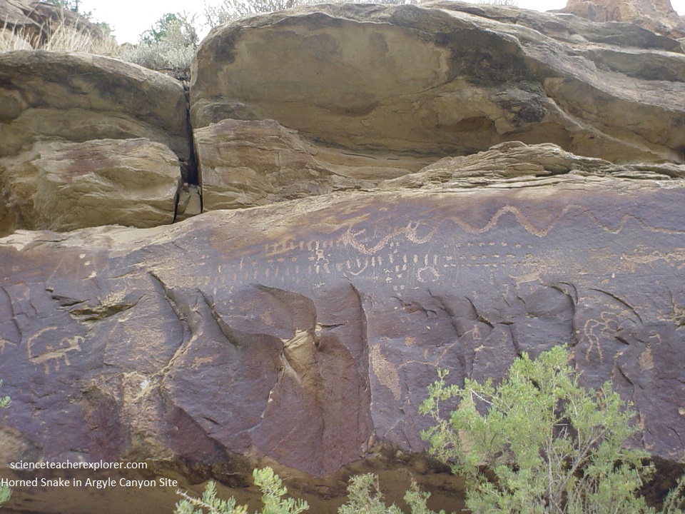 Pictured below, at 1.2 km east of the Argyle Junction and just past the large balanced rock on the north side of the road, the dominating feature at the panel is a rather supernatural-looking, four-legged figure with a series of circles around one arm. This has prompted some to call this figure “The Juggler” or “Balloon Man”. This panel reveals dot patterns, circles, a spider-web-like maze and another horned snake. The panel also features three human figures walking in profile holding a round item, perhaps a shield. Also interesting is a large mountain sheep with a rectangular body and cloven hoofs, a style attributed to the Fremont.