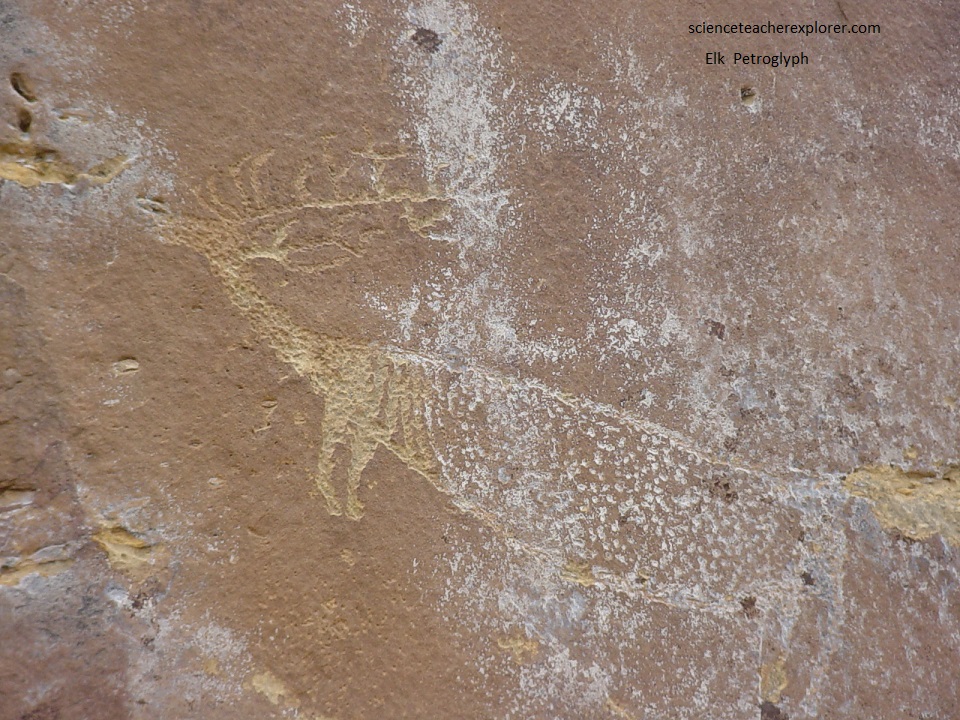 At this point, my tour-group turned around and drove back to Gate Canyon to eat lunch. Pictured below, at 1.5 km east of Gate Canyon and 10 m up on the northside cliff, we found this unexpected Elk or rain-deer petroglyph.