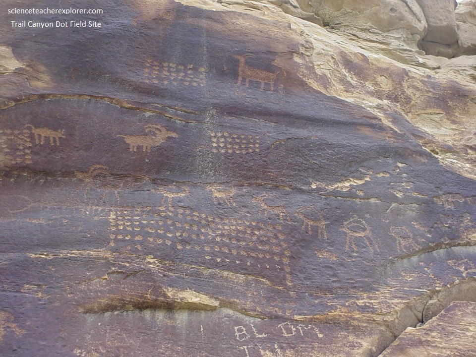 Pictured below, 3.2 km west from Current Canyon (or Sandhill Crane Site) up 9-mile Canyon, is a very complex site dominated by a series of organized dot fields, each interacting with animal figures (sheep). The dots are well organized and symmetrical, creating the impressions of large squares or rectangles. Next to the dot fields, is a large panel with an array of abstract, geometric, animal and human figures.