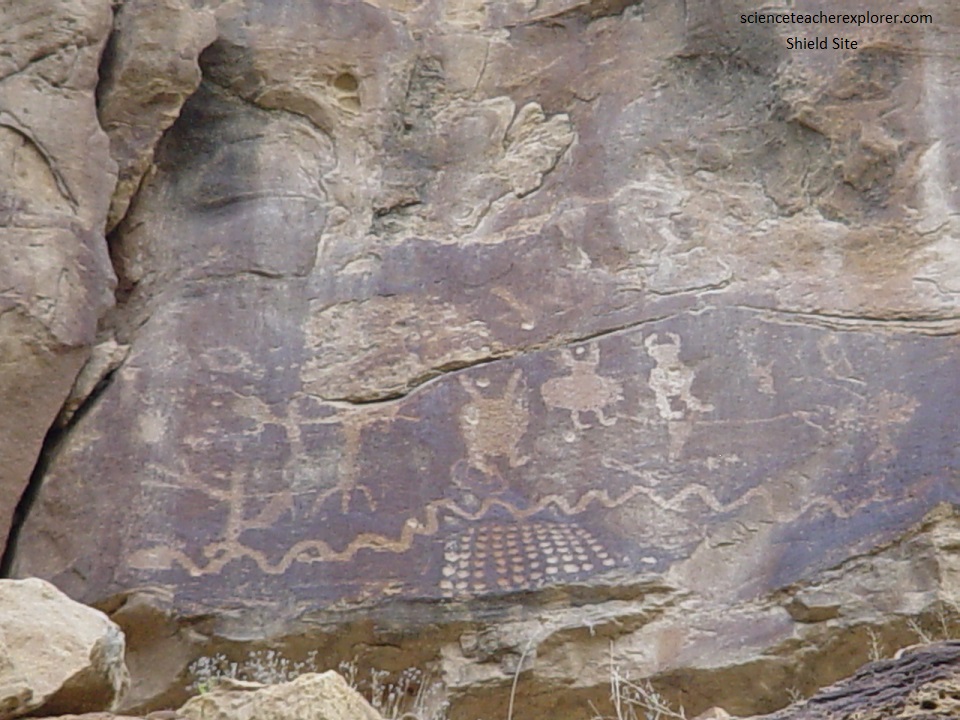 Pictured below, further up 9-Mile Canyon, this style is considered typical of Protohistoric times on the Plains, but it is generally not associated with the Ute. Shield-bearing warriors are common throughout the Tavaputs Plateau, including 9-Mile Canyon. In most cases, the Shield-Bearing Warrior Style elements are associated with Fremont rock art motifs, or with panels exhibiting a blend of Fremont and Anasazi motifs.