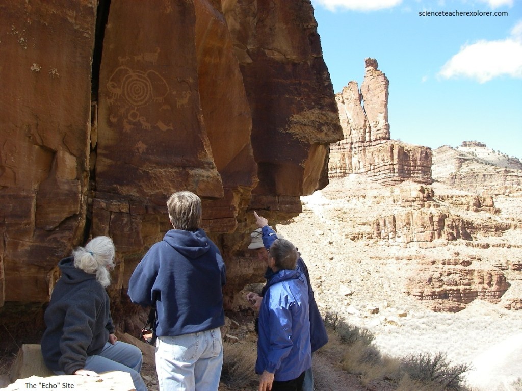 [Dry Canyon Road] Pictured below, our next stop in 9-Mile Canyon was up the Dry Canyon Road to the “Echo Site”. Proceeding up Dry Fork Canyon for about 1 km, the road straightens after Mummy Rock and rises toward a rock outcrop jutting toward the road from the right (just before a dry wash). A trail leads up the ledges to a petroglyph panel about 10 m above the road. Some of my tour participants are standing at this site, and the human voice has a very distinct echo. The petroglyph panel is dominated by a large bighorn sheep and a concentric circle that interacts with an animal and dots. One small figure appears to be holding a bow.