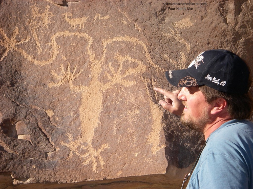 From Gate Canyon Junction, we drove west 3.3 km up 9-mile Canyon Road to the “Four Hands Site”. Pictured below, this site is actually a series of several complex rock are panels on the cliff level just above the road’s northside. The panel most visible from the road is a supernatural human figure with one set of extended arms and splayed fingers. A second identical set radiates from the head area. The figure lacks most classic traits of Fremont motifs, with the exception that large hands with splayed fingers (as if waving) are found on Fremont trapezoids.