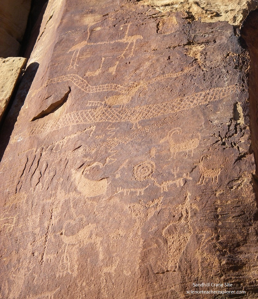 Pictured below, one of the most spectacular sites in 9-Mile Canyon is the “Sandhill Crane Site”, located at the western edge of the mouth of Currant Canyon. This site consists of several complex panels. The finest is dominated by a large elk pecked in outline. To the left is a large panel with two large horned snake figures pecked in outline with the bodies filled in with lines and cross-hatching. Above the snake figures are depictions of three birds, (two standing and one sitting). The two standing birds have long legs and long beaks, and the tail area is curved downward in an expression. The third bird appears to have a long beak that curves downward, similar to many different species of lakeshore and marsh birds.