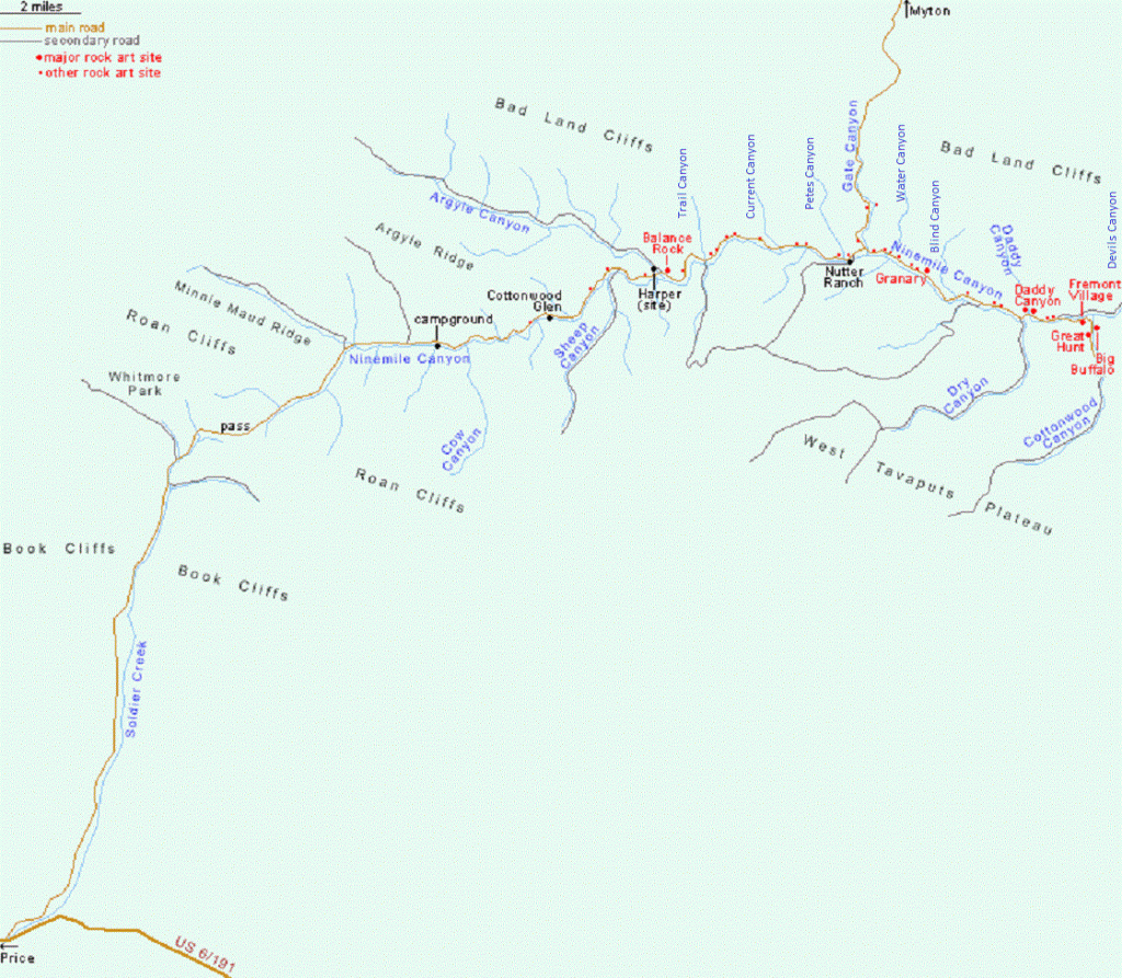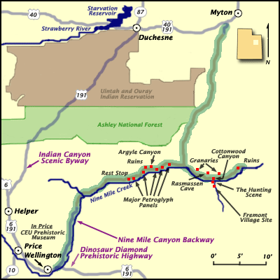 Most of the rock art was created by the Fremont Native-Americans who occupied this area some 1,000 years ago. Our tour started from Salt Lake City, Utah; and explored the canyon in a full day. We entered 9-mile Canyon from Myton, Utah (through Gate Canyon) and exited through “Soldier Creek” towards Hwy. 6 (Pictured below).