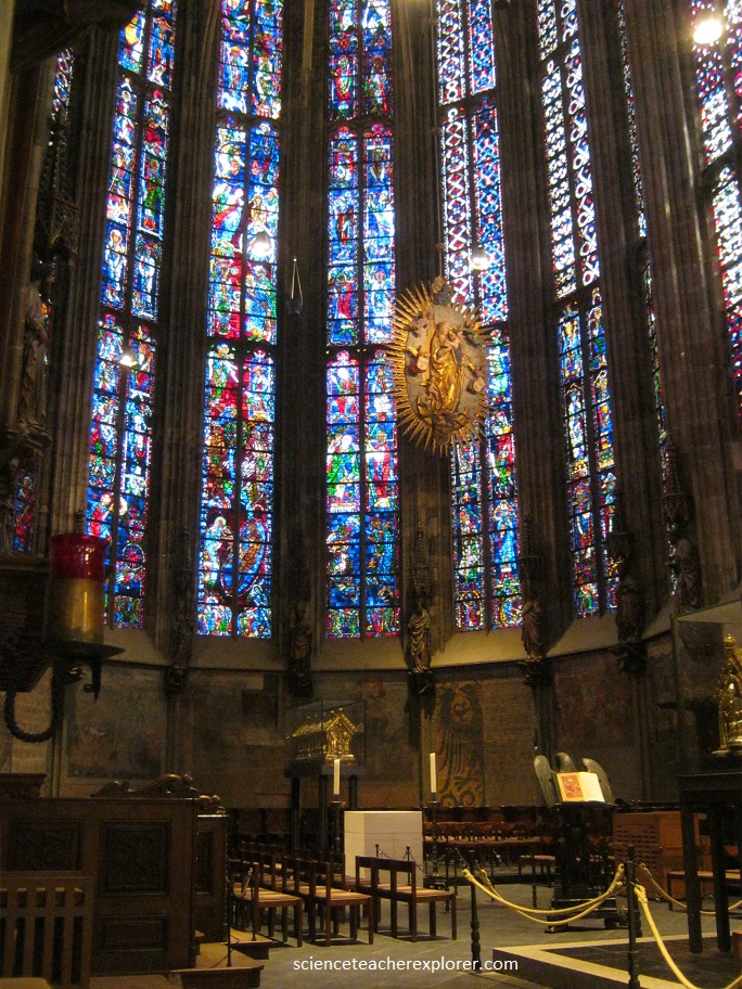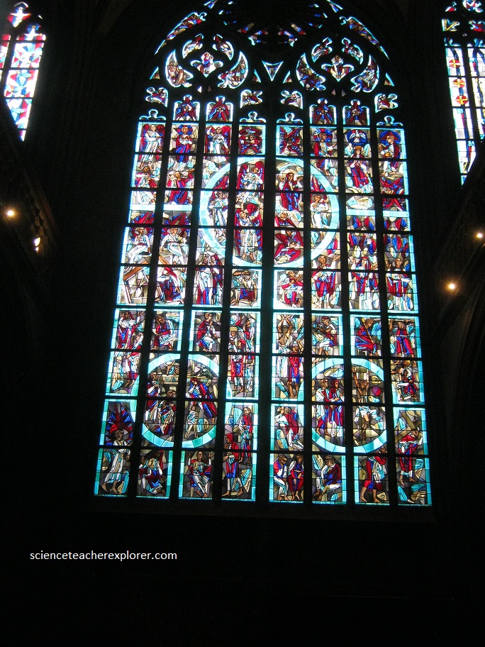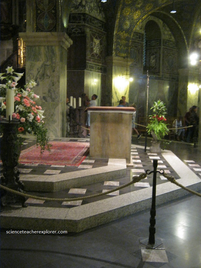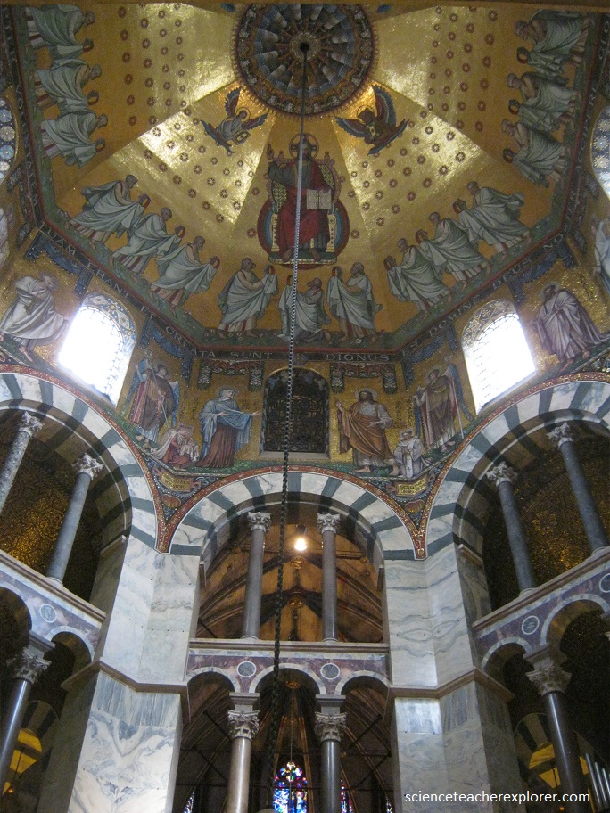 The photographer found that on Summer Solstice sunlight entering through the eastern octagon window would light up the crowned head of the emperor as he sat up his throne, (shown below). At the equinoxes, sunbeams falling at other angles also bathed the throne in light, suggesting that the architects had employed sophisticated astronomical knowledge to stage-manage mystical lighting effects for their emperor. From this story, I had to visit “The Aachen Cathedral”.