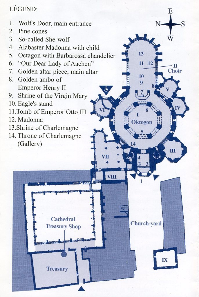 Pictured above, [lower right] is the Adlerpult (Eagle’s stand”, 15th century), a brass music stand for the choristers. [Lower center], The Memorial slab for Emperor Otto III (1834), who was buried in the Carolingian church in 1002. The sarcophagus was moved to this place in 1414 after construction of the gothic choir was finished. [Upper center], is the Radiant Madonna (strahlenkranzmadonna), a carving by Jan van Stevensweert (1524). The two-sided Madonna with child is surrounded by rays of light and by clouds. [Lower center], the Shrine of Charlemagne (1182/1215), a masterpiece of gold work of the Maas region. Ever since 1215, this shrine has held the mortal remains of Charlemagne (814 A.D.), who was canonised in 1165 A.D..