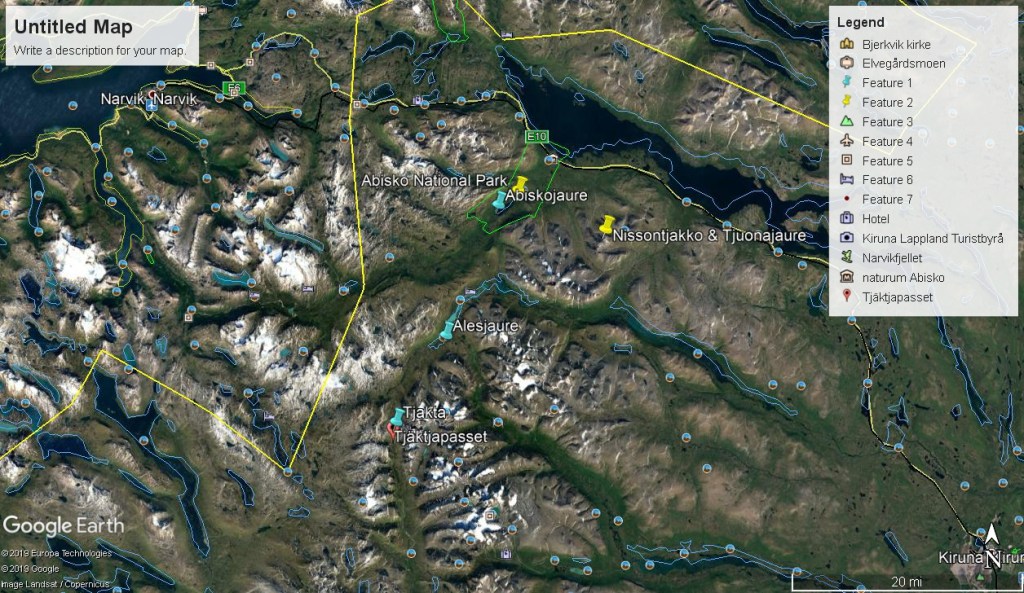 Pictured above, the image is looking north at the Abiskojaure Camp. I stayed here on the 1st and 4th nights.