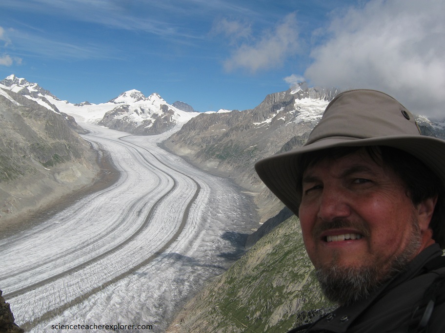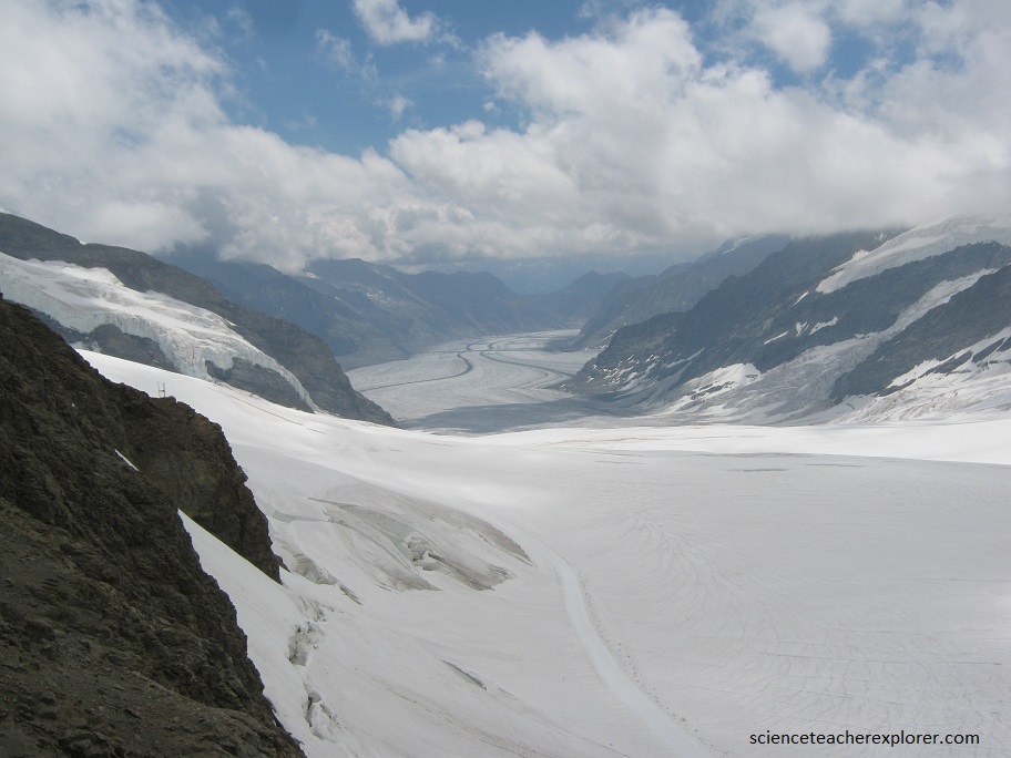 The region is plowed by the Aletsch Glacier, that is 15 miles in length and 3,000 ft. deep. Above the picture shows the Aletsch Glacier from the head looking south towards the Matterhorn. I’m standing in front of Jungfrau peak at the Jungfrau Meteorological/Climatological