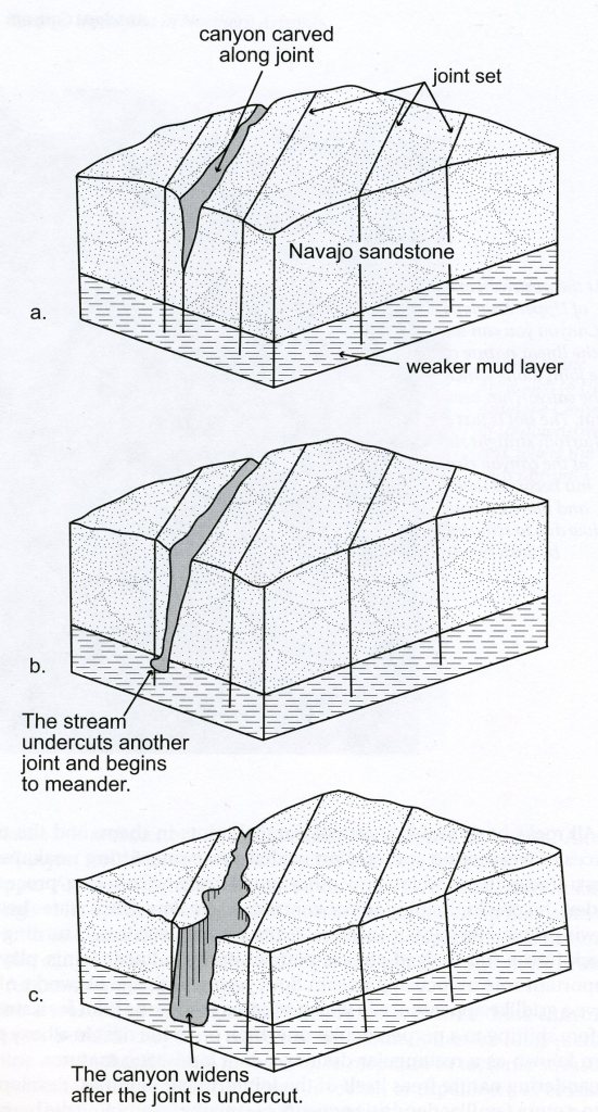 Joints favor slot canyon development because they act like guide grooves for a crosscut saw, focusing the flow of water and its abrasive load of sand and gravel. Joints concentrated the erosion as long as the host rock is strong, thick, and uniform enough to contain the river.