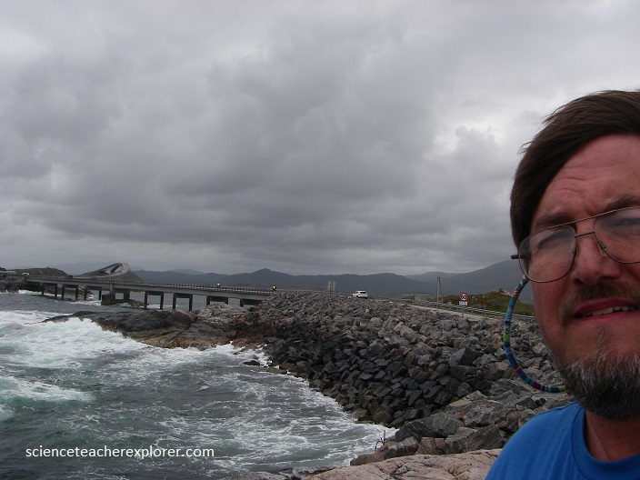 The curvy road dips and arches over the brutal waves of the Norwegian Sea that often crash over the pavement during storms, (pictured above).