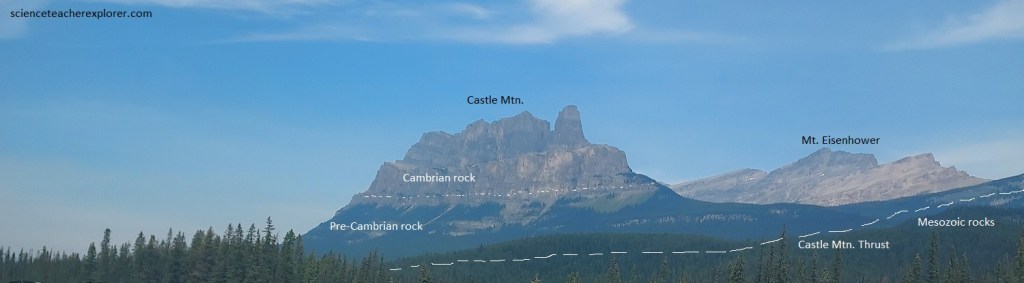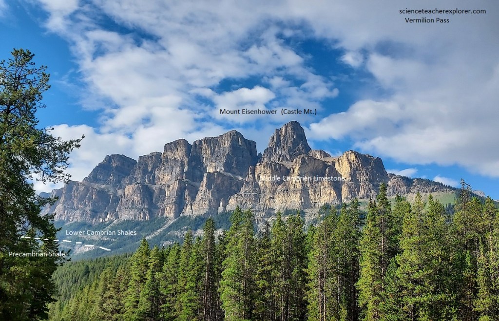 Pictured above, Precambrian rocks, purple and green, highly cemented shales or argillites, over 500 million years old, are the oldest rocks on this mountain range. They are overlain by Lower Cambrian quartzites and shales which form the dark layers below the cliffs of Mount Eisenhower and Helena Ridge. The cliffs are Middle Cambrian limestones, massive, jointed rocks that tend to break away in large angular blocks and leave steep cliffs. The same rocks for many of the peaks in this area. This mass of old rocks has been pushed up along the Castle Mountain thrust, the trace of which may be seen crossing the mountain face, (pictured above). This is one of the great thrust faults of the Canadian Rocky Mountains. The beds above the thrust faults are folded down into the trough (syncline).