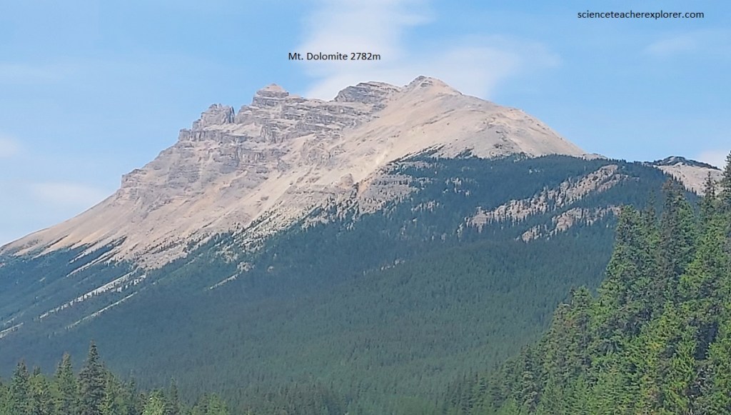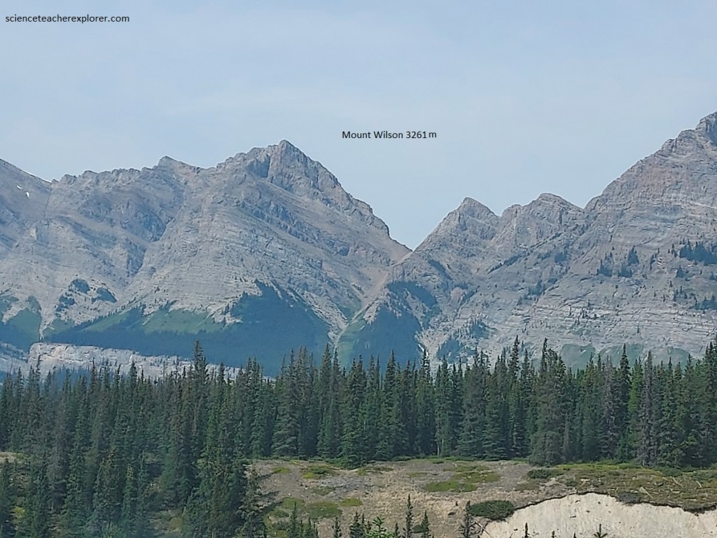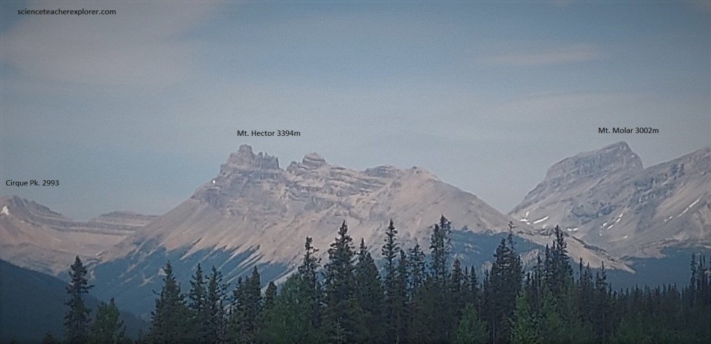 Later that afternoon, Becky and I continued our trip on the Trans-Canada Highway towards Jasper National Park. However, the Banff-Jasper highway turns off the Trans-Canada Highway and continues to follow the valley of the Bow River north by northwest to its headwaters at Bow Pass. Throughout this section of the park, the rocks that form the mountains on either wide of the Bow River valley are Precambrian and Cambrian in age. At the turn-off of the Banff-Jasper highway are outcrops of the oldest rocks in the area, the Precambrian Hector formation. These rocks are red, brown and purple argillites (hardened clay) and quartzites that were laid down by the sea late in Precambrian time. They form the lower slopes of the mountains in the vicinity, (pictured below). Above, are Lower Cambrian quartzites and shales and still higher, the massive cliff-forming light brown. Middle Cambrian limestones form the sheer brown cliffs of Mount Hector and Molar, (pictured below).