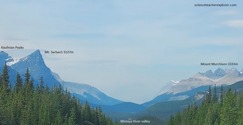 Pictured above, high above us to the east lie the enormous grey and yellow cliffs of Mount Murchison, a huge mass of Cambrian and Ordovician rocks on the eastern flank of the great anticline along which the valleys of the Mistaya River and the Bow River, far to the south, are located. Opposite to Mount Murchison is the long line of the Kaufmann Peaks that exhibits Middle and Upper Cambrian limestones, with some Ordovician rocks in the top parts.