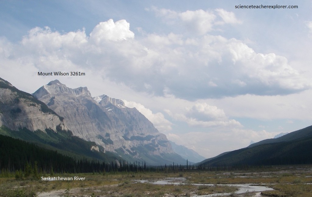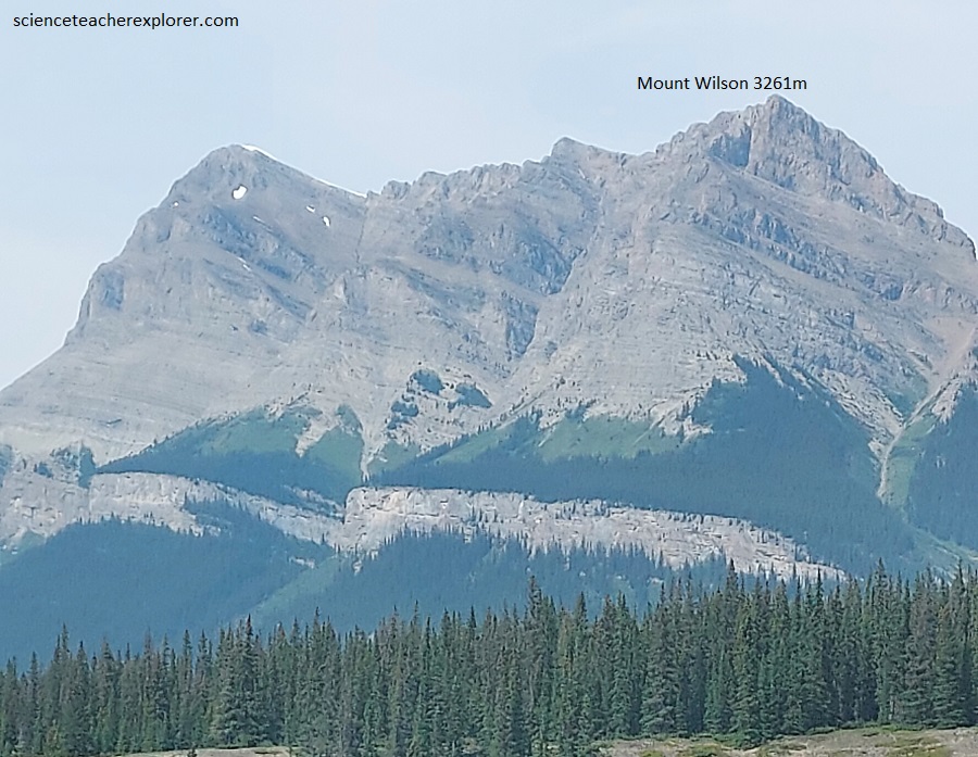 Across the valley of the North Saskatchewan River, which, on joining with the Howse River swings abruptly to the northeast from its prevailing south-easterly course, we will see the great bulge of Mount Wilson, (pictured above).