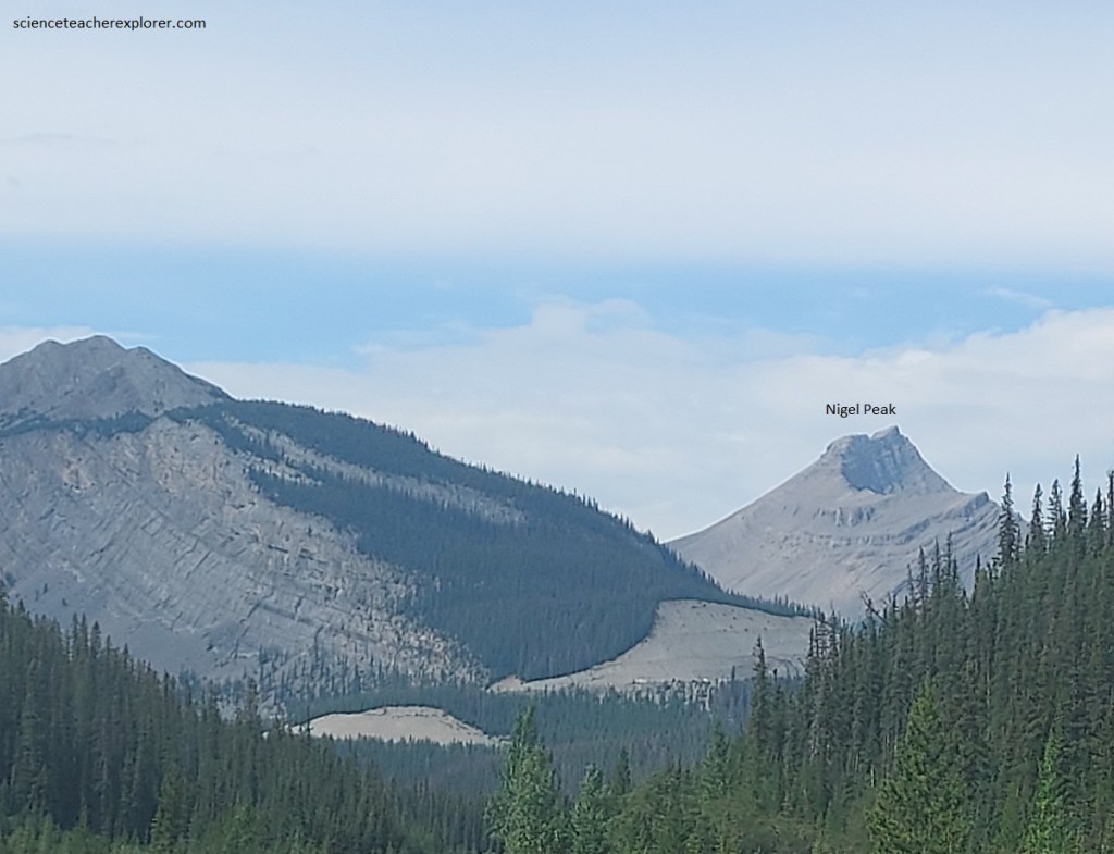 Pictured above, we can see stripes of green vegetation parallel to the rock formations alternating with great grey cliffs. This is because the rock units are different from layer to layer; the massive limestones break off to form the cliffs, and the softer, more shaly layers weather more rapidly to form chip-covered scree slopes, which in some places allow vegetation to take hold. The rocks there dip east on the east side of the anticlinal structure that the main valleys of the North Saskatchewan and Mistaya rivers follow.