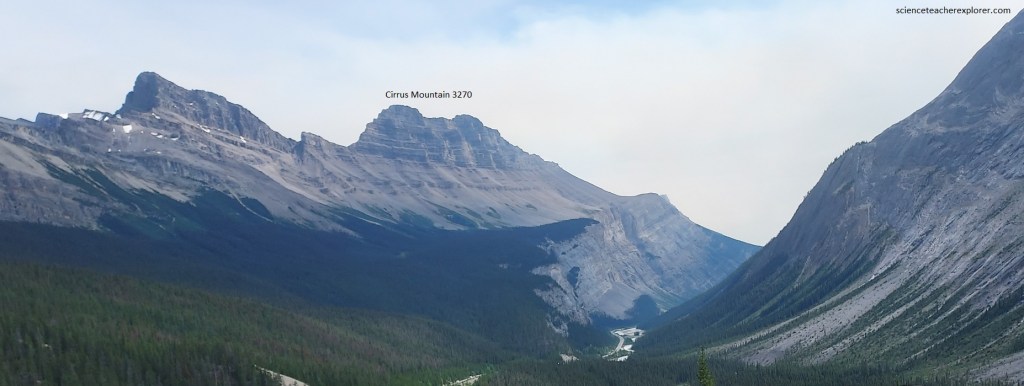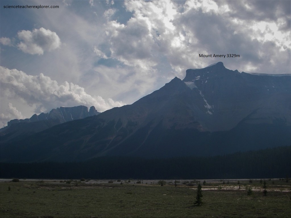 Pictured above, on the south side of the Alexandra River valley, Mount Amery rears its horizontally layered, flat-topped, cliffed summit. This mountain lies at about the axis or crest of the anticline or upfold that the road follows along, and just east of , for tens of kilometers. For this reason the rocks in it, being of Cambrian age, are older than those on either side and are flat-lying. On Mount Amery’s flank a very deep valley cuts into the brownish and greyish (upper) slopes, making a horseshoe-shaped ring of mountains.
