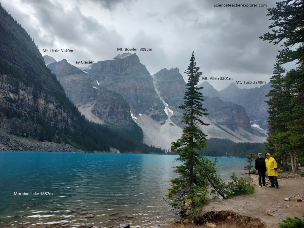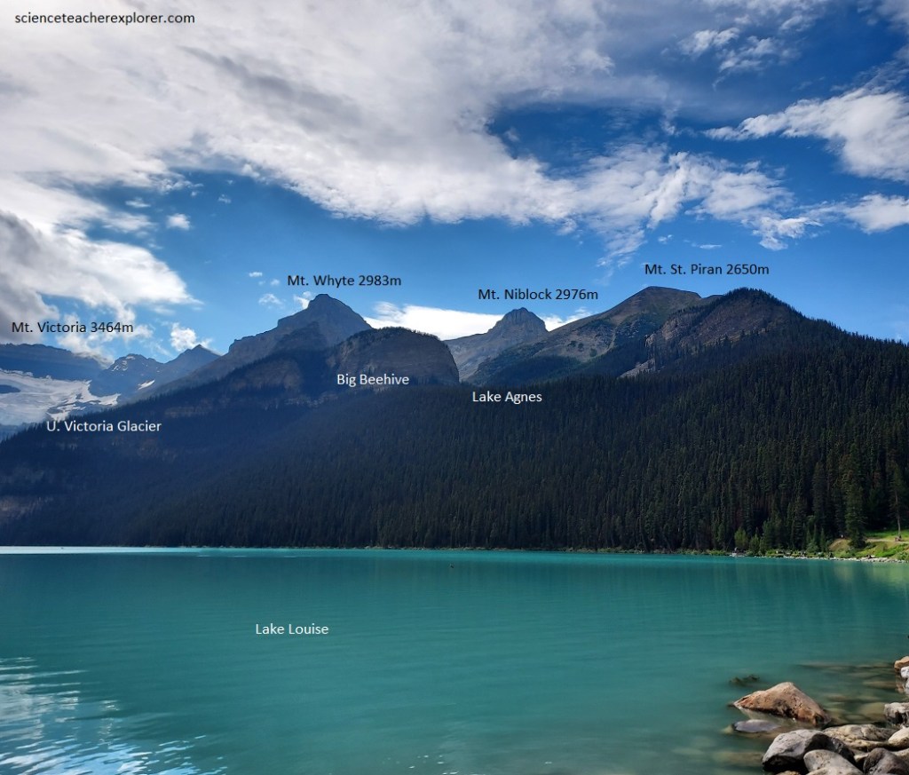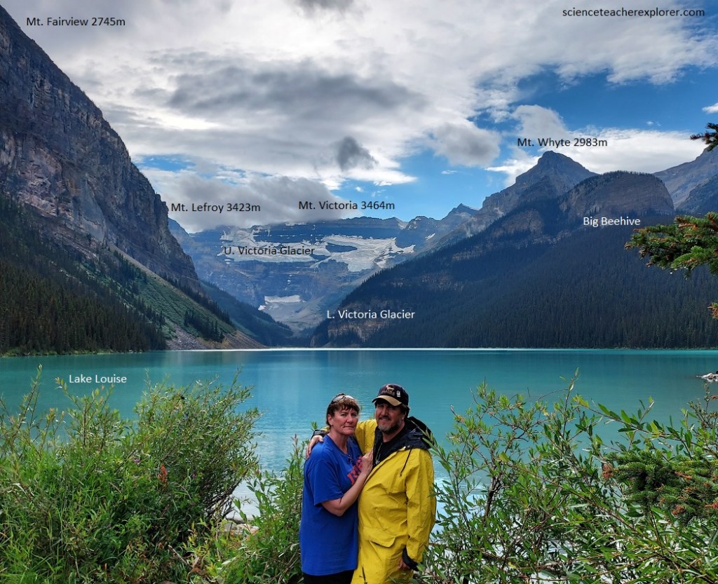 Later that morning, Becky and I explored the nearby Lake Louise. Pictured below, Lake Louise is surrounded by high mountains made up of rocks of Precambrian and Cambrian age. Precambrian rocks floor the valley at the outlet end of the lake, (where we are standing). Lower Cambrian rocks top the low knobs and Middle Cambrian forms the brown glacier-spangled cliffs of the higher mountains in the distance. Mount Victoria is capped by Upper Cambrian.