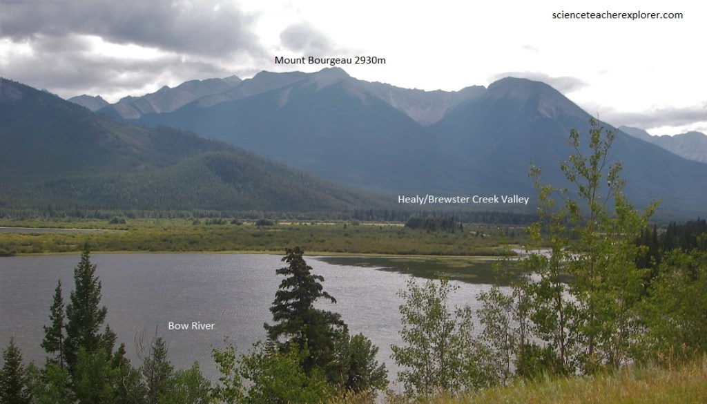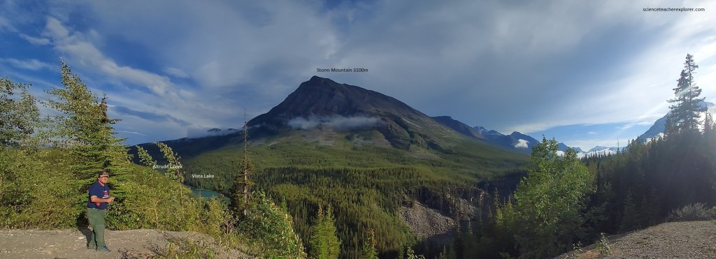 Pictured above, from the Continental Divide (Banff/Kootenay park boundary), Vista Lake les on the valley bottom far below and to the left of this viewpoint in its dark sylvan setting of forest. Opposite and lower down, remnants of a moraine loop along the base of Storm Mountain, showing that the glaciers were once here. Across the valley, Storm Mountain shows dipping Precambrian and Lower Cambrian quartzite series in its red-dish brown slopes. High and to the right of Storm Mountain is Stanley Peak with its snowy top with glaciers here and there.