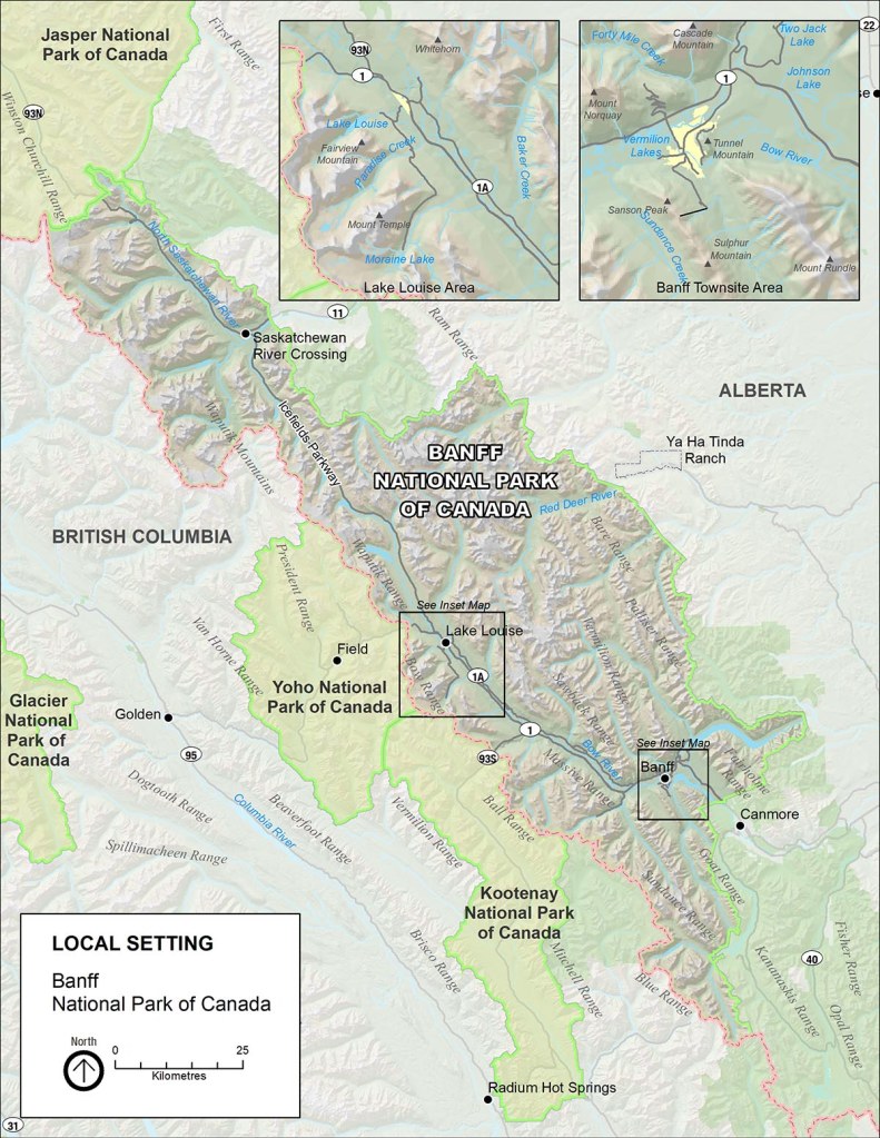 In August of 2022, Becky (my wife) and I were exploring the Canadian Rockies. Some of the most beautiful mountain scenery in the world is to by found in the Rockies of western Alberta and adjacent eastern British Columbia. An area of 6,641 square kilometers in this region has been set aside as Banff National Park for the enjoyment of present explorers like ourselves. The western boundary of Banff National Park is the Great Divide and the rivers which rise in its vicinity flow into the Arctic, Atlantic and Pacific oceans. Pictured below, the park may be entered from the west through the Kootenay and Yoho National Parks in British Columbia, and from the north through Jasper National Park, in Alberta. The entrance from the east is probably the most spectacular because the mass of the Rockies is in view continuously for the beautiful approach of more than 100 km from Calgary until the park gate, and that is the way Becky and I chose to start exploring.