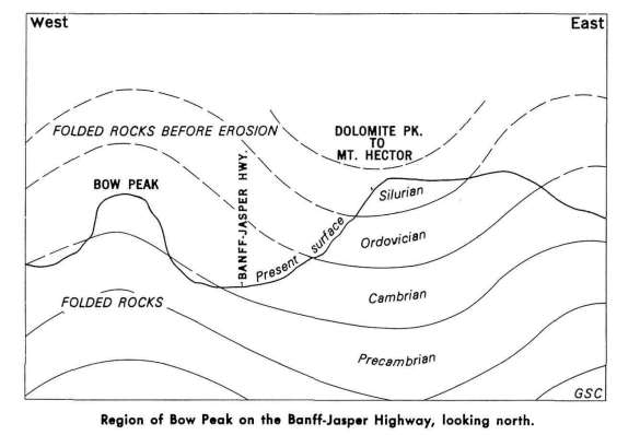 Imaged below, along the Banff-Jasper Hwy. near Bow Lake, along the east side of the valley, brownish mountains are clearly different from those on the opposite or western side of the valley. These is because they are cut in rocks that are younger than the rocks of the Waputik Range and those in Bow Peak. The distribution of the old and young rocks here is explained on the basis of the regional structure. Bow Peak lies directly on the crest of an anticline. To the west the rocks dip westward and to the east the rocks dip eastward.