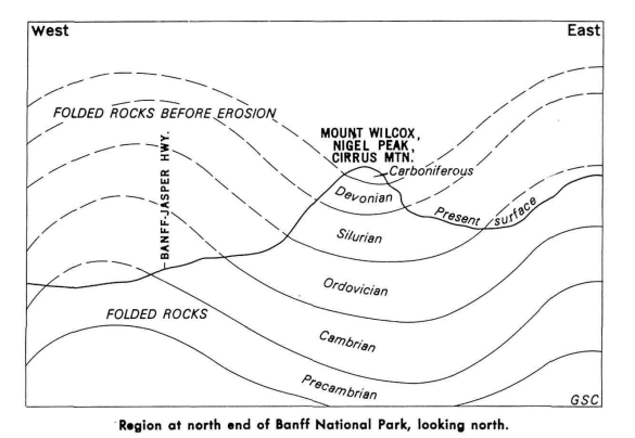 An amazing view of the syncline in Cirrus Mountain is offered from the Banff-Jasper Hwy. on the Parker Ridge, (pictured above). The valley of the North Saskatchewan River leads southward into the distance. Far below, it passes under the great cliffs of Devonian limestones with the Alexo Formation and Fairholme Group in the lowermost slopes, and the major part of the very steep upper cliffs in the Palliser limestone. The upper slope of the Palliser limestone forms the clearly shown shoulder, above which lies the more gently weathering brownish Banff shale, of Mississippian age. The top peaks of the mountain are again in grey limestone, (the Mississippian Rundle limestone). Additionally, we see that the rocks on the southwestern end of the mountain dip generally eastward while those on the other end dip generally westward, and the trough-like synclinal arrangement is clear, (imaged below).