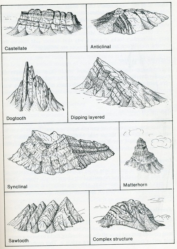The surface of the land presents an extremely rough and varied scenic scenes. Mountains of many different shapes and sizes stand high above deeply incised valleys. The mountains are sculptured from great up-arched or masses of rock which formed from sediments laid down in the seas that covered the area some 500 million years ago, in the Cambrian Period. In some places the rocks are lying flat, even in the highest mountains; in others they are standing on edge. Deep etching of this irregular mass has resulted in a great array of mountain types, (from those with sharp jagged peaks to those resembling castles). The sides of the mountains, extending as they do through thousands of meters vertically, expose many varieties of sedimentary rocks (imaged below).