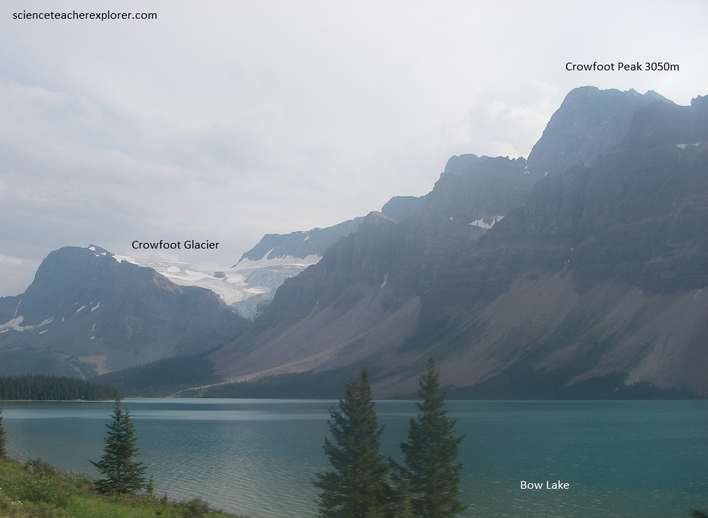 Pictured below, Crowfoot Glacier sends two long fingers and a short stubby on (with the meltwater stream) over the rock surface opposite from the north-eastern shore of Bow Lake. A snowfield that is largely hidden behind the large cliffs to the south. The moraines below this photo show where the ice used to flow and fall over the cliff, become reconstituted, and then push the debris out from the cliff face itself.