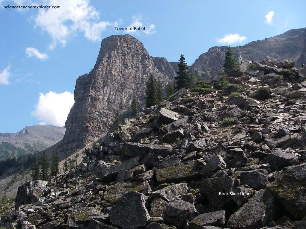 Pictured below, it is suggested that the younger rock slide involves huge masses of rocks from near the Tower of Babel (that larger tower of rock on the left of the photo below) collapsed and produced an enormous flowage of rocks which cut across the end of the lake, raising it considerably and making the present dam.