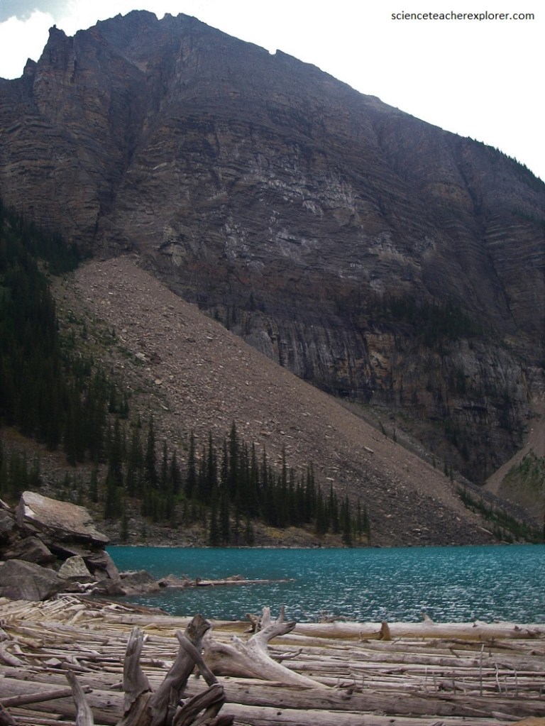This area is ringed by a series of peaks consisting mostly of grey and brown quartzites and slaty shales of Cambrian age. These are broken by more or less vertical joints or cracks, which have had a considerable effect on the erosion of the mountains because they allow the rock to break away from the main mass along these cracks and thus leave vertical faces. The nearly horizontal stratification in the rocks is clearly visible in almost all the peaks. It seems likely that the depression in which Moraine Lake lies began as a glaciated valley.