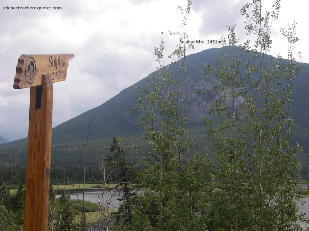 Pictured above, the green slopes with occasional struts of grey Palliser limestone mark the end of Sulphur Mountain. Just under Sulphur Mountain peak, are banded brown-weathering Banff Shales. The black (Exshaw) shale at the base of the Mississippian is clearly exposed in the gully on Sulphur Mountain, south of the gondola lift. Not far above the terminal of the gondola lift is the thrust along which the Paleozoic rocks rode over the younger, Mesozoic, rocks of the valley below. The latter, Triassic rocks of the Spray River formation. It is along this thrust and the cracks in the rocks associated with it that the Sulphur Waters of the hot springs within the Banff Village find their way.