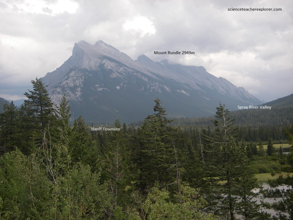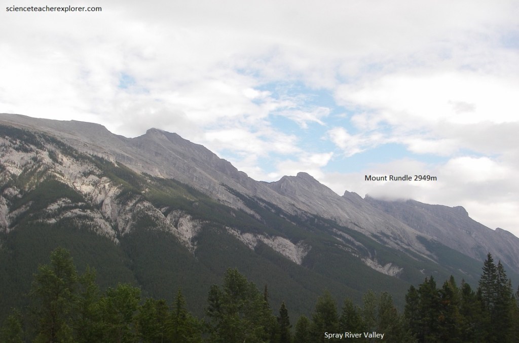 Pictured below, the very crest of Mount Rundle is made of the Rundle limestone and from here it looks like a capping along the top. The slopes seen from here on the northeastern and eastern sides of Mount Rundle are irregular because the rocks dip westward and we are looking at the broken edges of the dipping rock formations. Directly below is the valley of the Spray River on the right, joining that of the Bow on the left. The Spray River rises as it does in a series of streams that pour into the Bow Valley, but cuts across the trend of the mountains. This water used to drain generally north-westward along a fairly large open valley, then suddenly abandoning the valley to flow directly across the trend of the mountain ridges, (Sulphur Mountain in the northwest and the Goat Range in the south-east), to flow in a valley that really belongs to Goat Creek. However, it follows northeastward to where we see it joining the Bow River near the Bow falls.