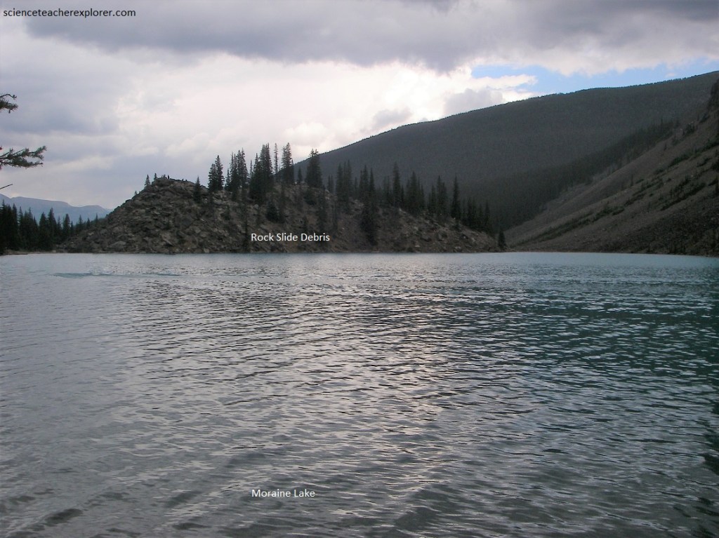 However, some scientist suggests that a temporary renewal of glacial activity produced a long tongue of ice, which picked up a good deal of landslide debris from the talus and rock-waste slopes along the lake and pushed it up into those steep masses (imaged below).
