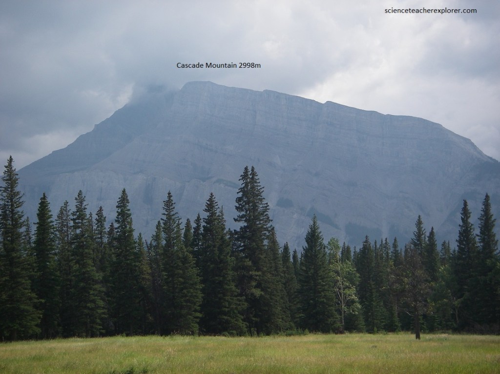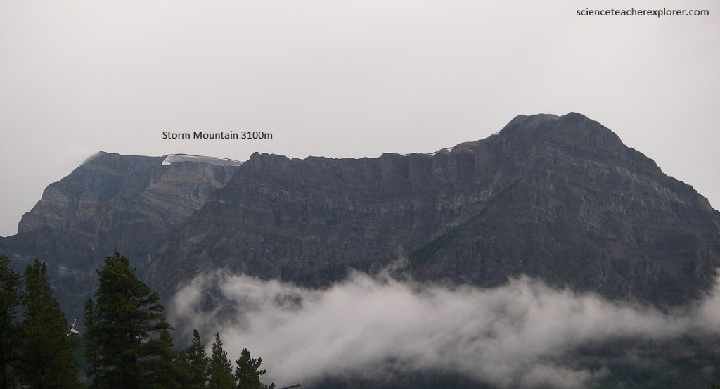 Pictured above, the mass of Storm Mountain forms the husky left shoulder of the valley that leads to Kootenay National Park. Storm Mountain is made of Precambrian and Lower Cambrian quartzites, but if we follow the dip of layers toward the left (east), we will see that they dip under its peak, which is topped by younger Cambrian limestones.