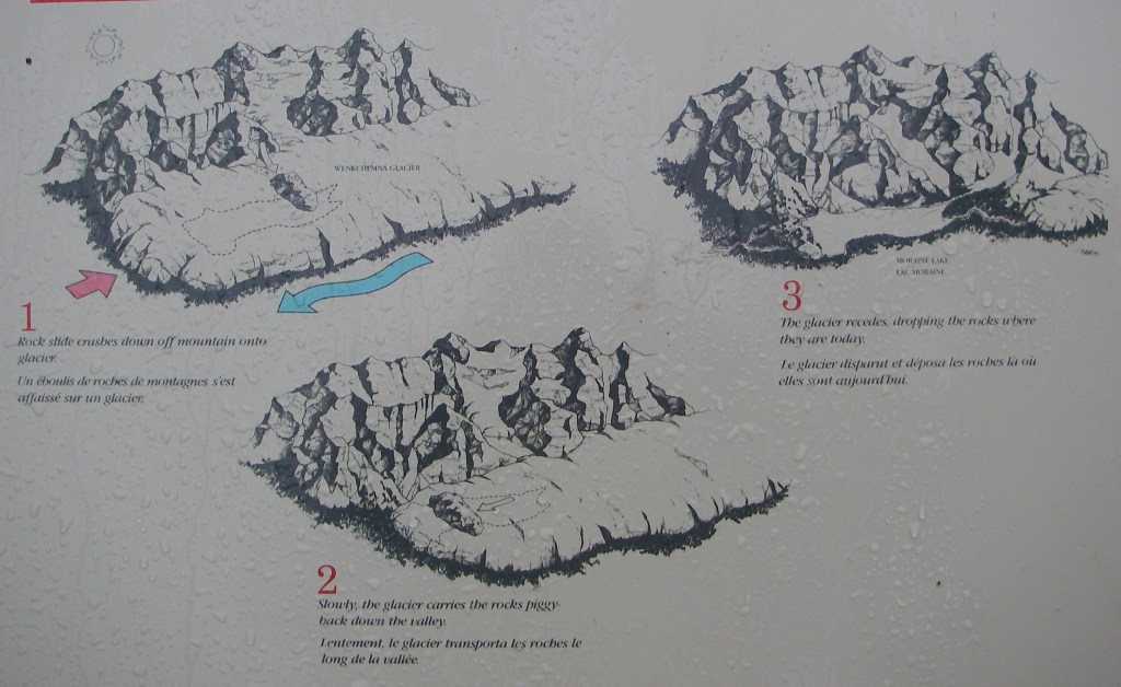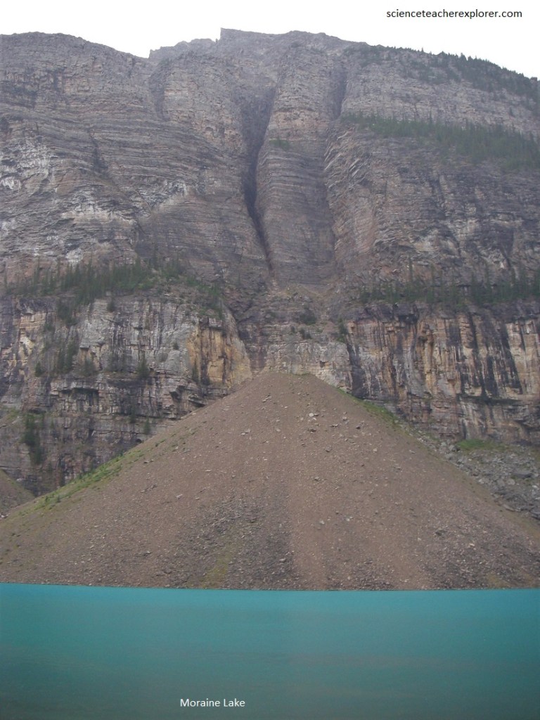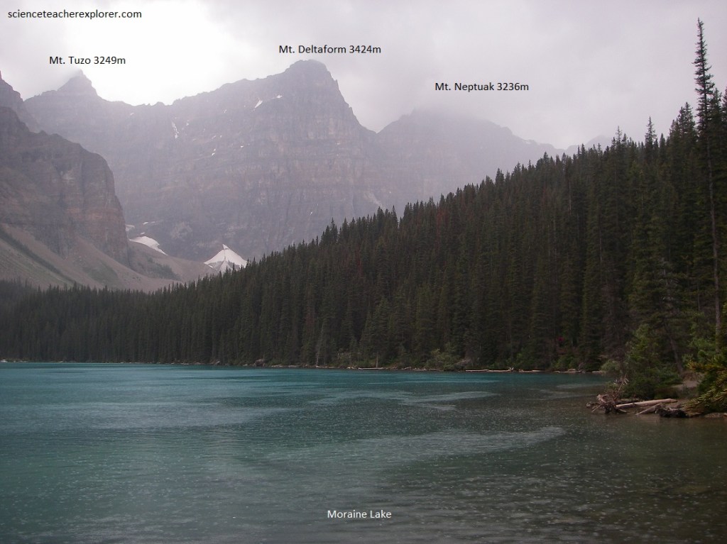 From the road that goes to Lake Louise, we turned left to explore the Valley of the Ten Peaks with Moraine Creek flowing through it. This is a hanging valley and far below may be seen the valley of Bow River and Moraine Creek winding into it. Pictured above, Moraine Lake is a beautiful gem lying in a valley carved by the glaciers among the great peaks of the Canadian Rocky Mountains.