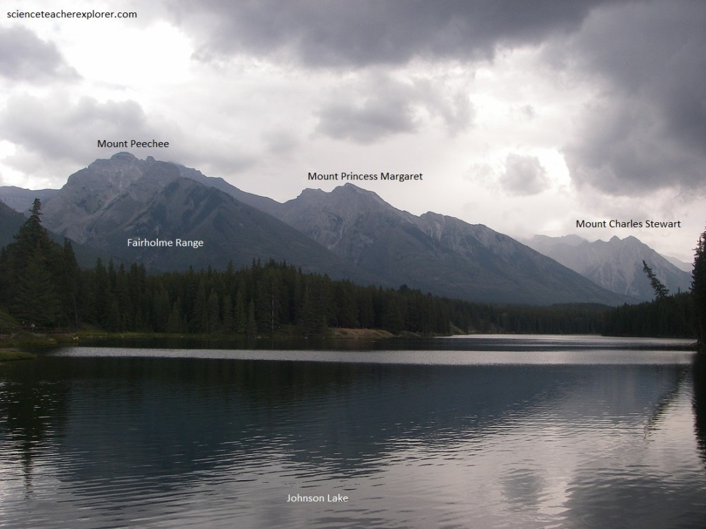 Coming into Banff National Park from the east we saw the skyline of the high Rockies beyond the foothills with tall sharp peaks, more gently rounded ones, and others with one side steep and the opposite one more gently sloping. Pictured below, from the Trans-Canadian Highway #1 we turned at the junction of Lake Minnewanka road. From this road junction the view southward shows a magnificent procession of jagged ridges along the crest of the Rundle Range on the west side of the Bow Valley. Here and there are glimpses of the Fairholme Range on the eastern side of the valley. Pictured below, Mount Charles Stewart lies to the right of the Johnson Lake Valley and Mount Princess Margaret to the left. The rocks in both of these peaks dip westward toward the Bow River valley, along which the highway #1 is located.
